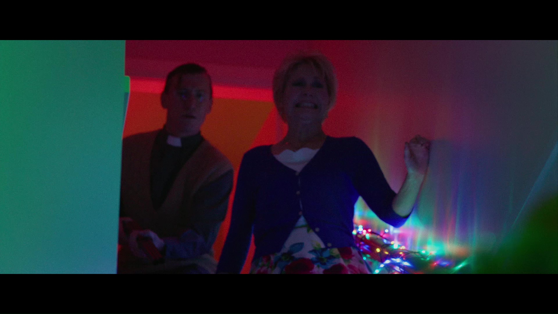 things lively with chats about the very low budget (only Wallace got paid among the actors), the influence of films ranging from The Family Stone to Christmas in Connecticut, a real Christmas family encounter that inspired him, the dicey nature of the subject matter and the research involved, and plenty more. Wallace appears for a video interview (19m43s) with Anderson, which features an opening disclaimer about his inability to keep her in focus(!) but nevertheless entertains as she chats about asking for a violent fate involving a four-year-old girl to be excised, working Cujo and 10, and leaping at the chance to do a highly challenging role after a very long time. A visit with O'Dwyer (9m57s) by Anderson and Campbell with a conversation about how they first got together in 2008 and built up a rewarding professional collaboration starting off with an award-winning short. Don't miss his reenactment of a famous horror scene, too. A blooper reel (3m26s), a brief innocuous deleted scene (45s), and a quick video interview with the director (1m40s) over ice cream round out the main content of the disc, which also features bonus trailers for The Anatomy of Monsters, The Devil Lives Here, and Vampyres.