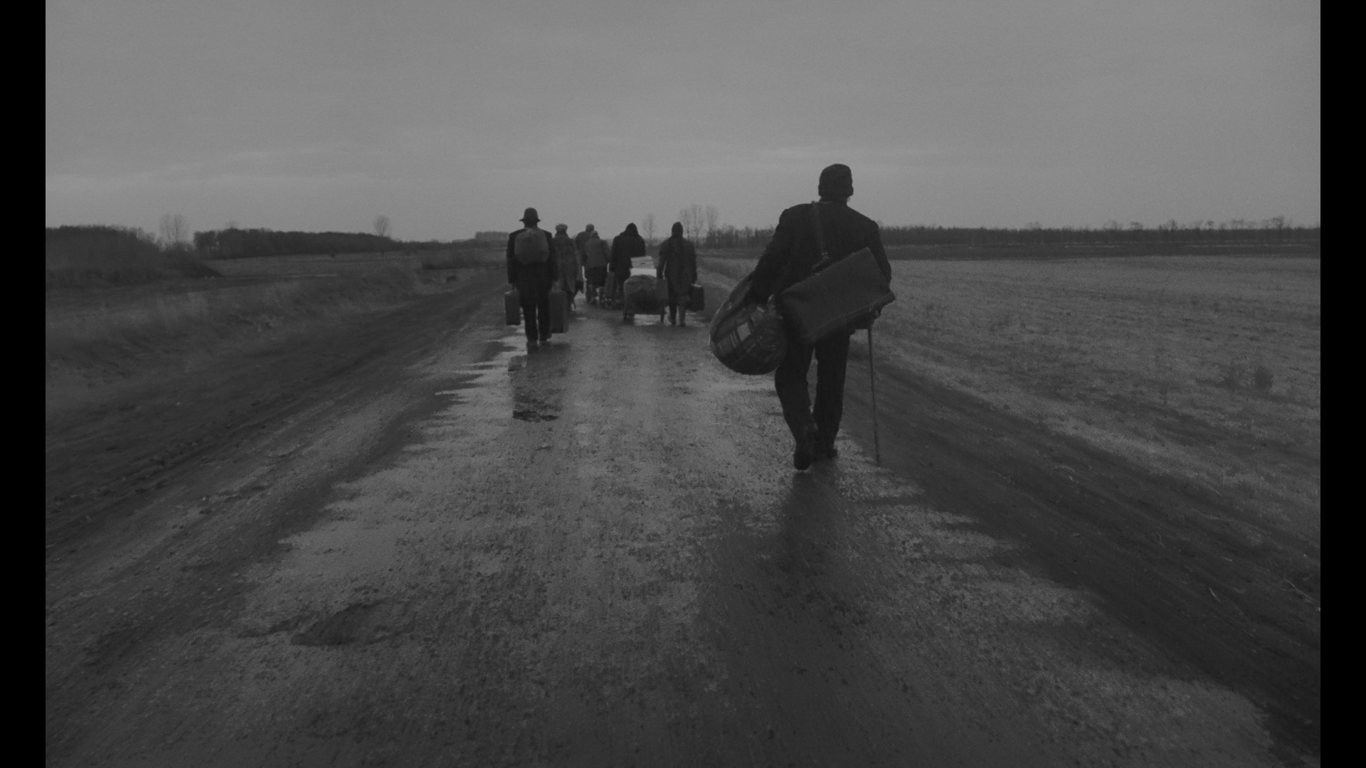 "Orders of Time in Motion" (19m31s) by Kevin B. Lee takes a look at the purpose of the film's long shots (which average out to about 2.5 minutes overall) as they invite the viewer to bring their own perceptions into the images on screen with the camera movement inviting you to find your own way into the film and its human elements in a way unlike traditional cinema. A 2007 archival interview with Tarr (23m7s) conducted by Howard Feinstein at the Walker Art Center spends some welcome time with the filmmaker discussing the film, his approach to Krasznahorkai after receiving the manuscript for the source novel many years earlier, and the theme of loneliness that dominates the film. The U.S. reissue trailer is also included; the specs list a new essay "How to Watch Sátántangó" by Janice Lee and Jared Woodland, though that wasn't in the edition provided for review.