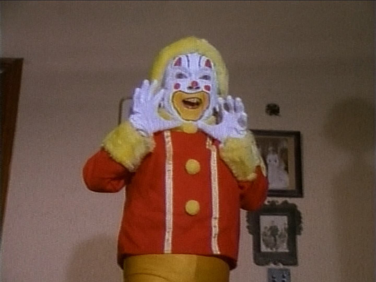 demonstrated by 1993's Herencia Diabólica, a zesty killer doll movie from prolific writer-director Alfredo Salazar (who did lots of Santo movies and other insanity) that doubles as nightmare fuel for anyone with a clown phobia. Technically this was initially shot on 16mm and then completed on video, so that's close enough to count. Here's the tender story of Big Apple coupe Tony and Annie, who have to head south of the border when his rich aunt dies and leaves them everything -- including her creepy homicidal clown doll that comes to life now and then to kill people. First to go is Annie, who gets shoved down the stairs just as she's about to give birth. The baby lives, grows up fast to elementary school age, and develops a creepy
