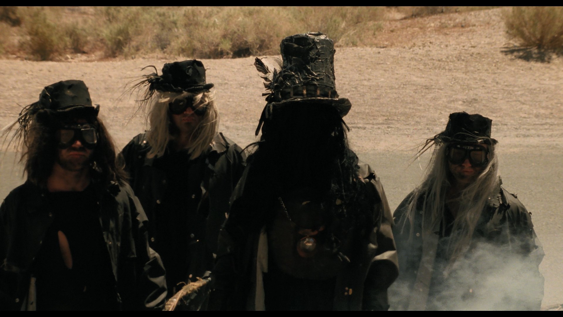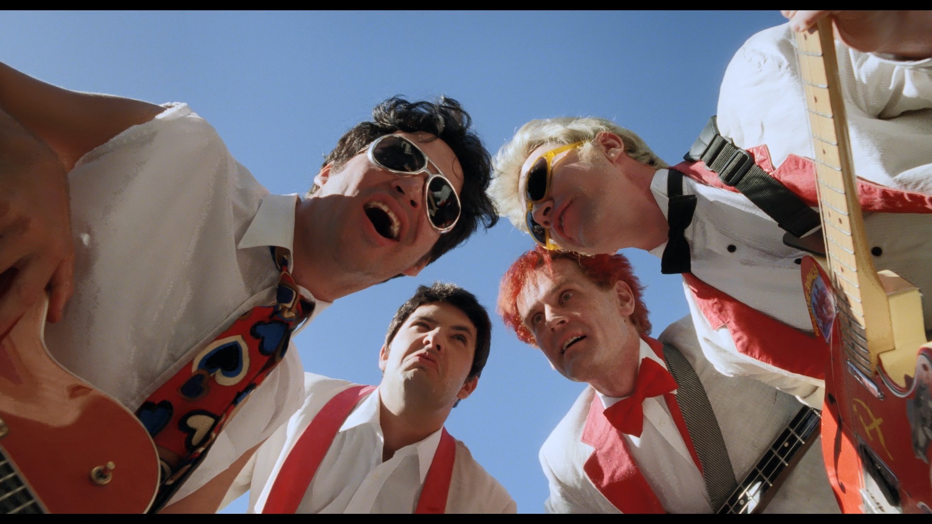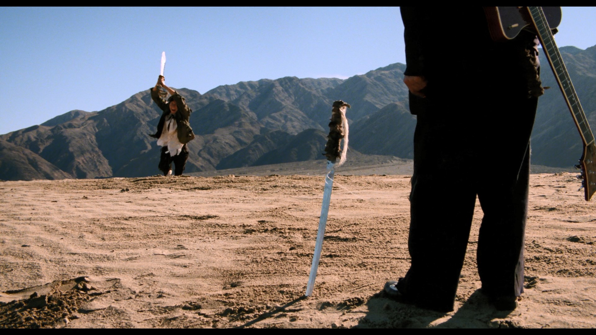 vying to catch on with young arthouse-going moviegoers who had made superstars out of the likes of Quentin Tarantino and Robert Rodriguez, who had made referential moviemaking a new kind of spectator sport in the wake of Pulp Fiction, Reservoir Dogs, and El Mariachi. That meant a lot of films got lost in the shuffle with screens jammed with films like 2 Days in the Valley, The Boondock Saints, Freeway, Killing Zoe, and so on, though all built up admirers to one degree or another. One of the most colorful and eccentric of these was Six-String Samurai, which rode a huge wave of buzz after an ecstatic debut at Slamdance but never quite took off during its release from Palm Pictures (who was really gunning for cult credibility around this time with The Basketball Diaries and Ghost in the Shell). A hodgepodge of references with overt nods to El Topo, The Road Warrior, Lone Wolf and Cub, The Wizard of Oz, and multiple music acts, the film is divisive by nature but has managed to keep up a certain level of fan awareness over the past 23 years in spite of being treated very poorly on video with only a mediocre non-anamorphic release in 1999 representing it on the DVD market. In 2021, Vinegar Syndrome swung the other direction with a vengeance by giving the film a lavish UHD and Blu-ray special
