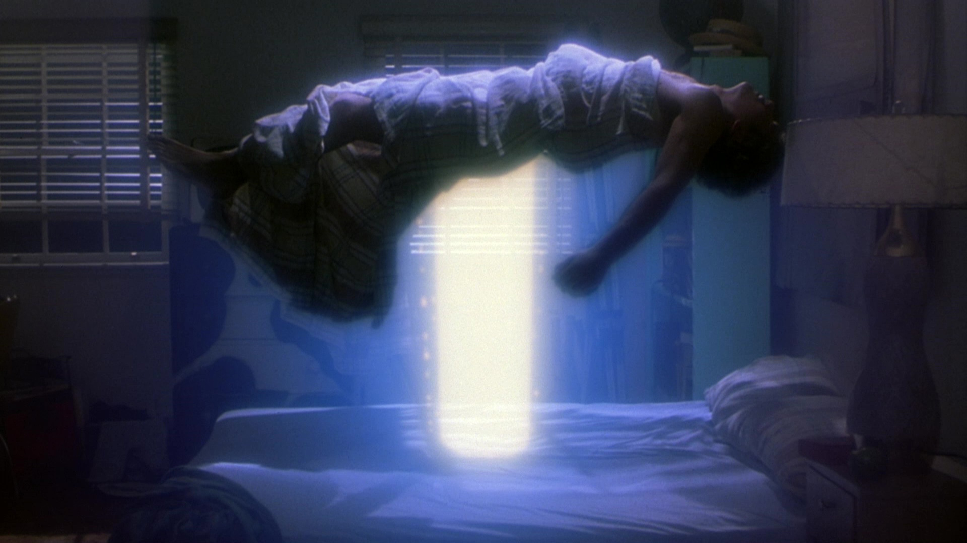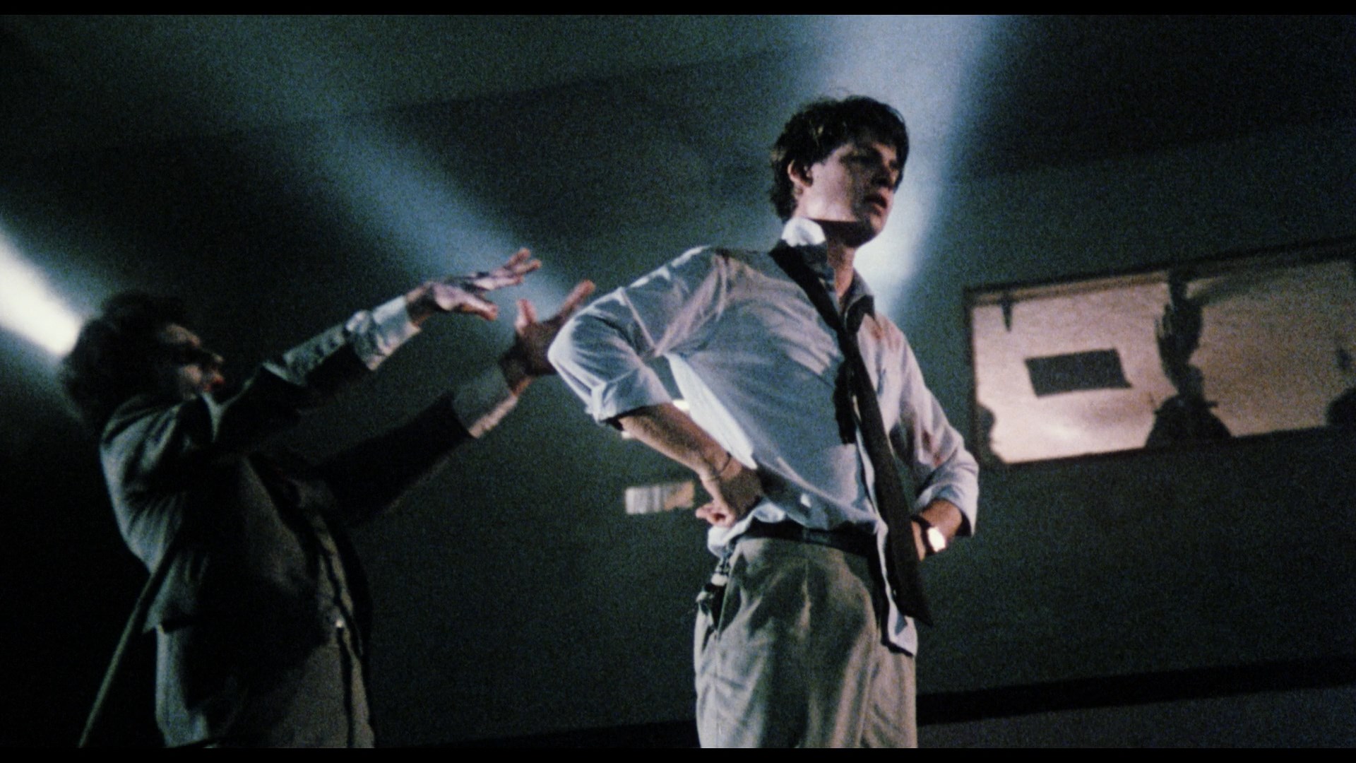 making its second appearance on Blu-ray. Released just as the '80s horror boom was dying rapidly, it may not make a ton of sense but you have to give it credit for trying every trick in the book. Adopting the smoky, stylized look of music videos for much of its running time, the film plays like a college/prison gumbo offilms like Demons, Trick or Treat, A Nightmare on Elm Street, and Witchboard, with enough gore and bare skin to make audiences happy andenough stupidity to make critics pull out their knives. Needless to say, if you're an '80s horror junkie, this former VHS fixture delivers the junky goods. Plagued for over a week by nightmares in which he's chained up and mutilated by a clawed demon, college student Alex (Celozzi) is told by his buddies that his dreams must be connected to a macabre incident at nearby Alcatraz in which four members of a rock band called Body Bag were horribly murdered just before their tour boat was set to take them back home. The situation gets worse when he starts having waking visions of monster hands bursting through the walls of a restaurant, worms crawling out of his cheek, and a beast bursting into his bedroom to rip open his chest. His older brother, party boy Richard (CHiPS' Reilly), is concerned when Alex's dreams start manifesting in reality, first in scratches on his neck and then in more overt ways, and after a bit of research by his girlfriend (Denton) and their friends, it turns out there's a nasty demon lurking in Alcatraz that was temporarily raised by those pesky dead rockers. Now Alex appears to be harboring the secret to what really went down, so they all head out to Alcatraz from the night where they encounter spooky rock queen Sammy Mitchell (pop singer and dancer Toni "Mickey" Basil, sporting some crazy hats), her mangled band mates, and the fanged demon itself.