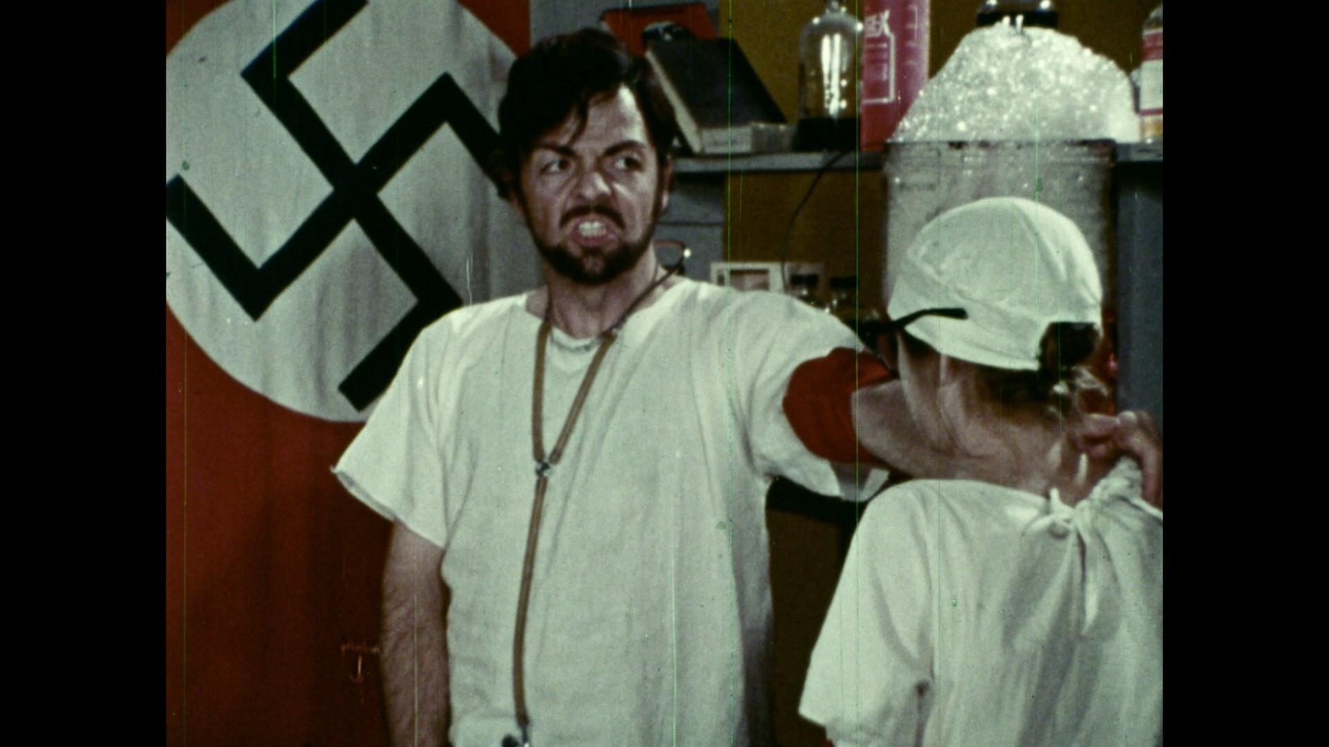 the "Pornos Vol. 2" disc which begins with more Third Reich nonsense: Dr. Cock Luv, also known as Nazi Sex Experiments and a familiar title from both Something Weird and After Hours Cinema on DVD. Victor Alexander returns as a mad Nazi doctor who spends his time barking at his idiot assistant, Fritz. They're working in a bunker where several women are being held captive and used for experiments in the human libido. Cue the various straight and lesbian sex scenes, probing of naked women on operating tables, and yelling about the Allied forces closing in and putting a stop to all this madness. Again this one is taken from a print and looks better than it has before, relatively speaking, given that it looks like it was edited with masking tape.