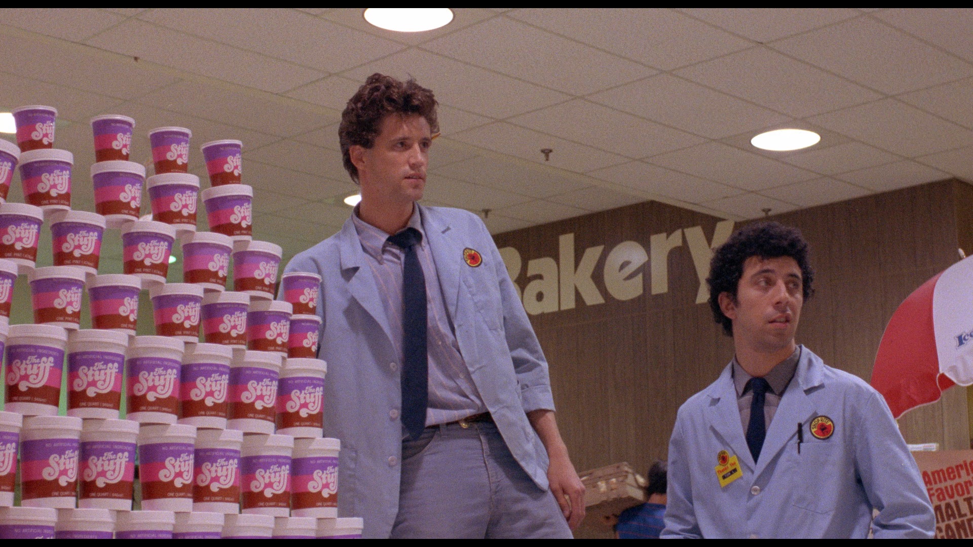 In 2025, Arrow revisited The Stuff as a two-disc edition featuring a UHD with a HDR10-compatible Dolby Vision grade for the new restoration from the original camera negative. As you would expect, it looks quite stunning with those very '80s neon colors popping off the screen and the detail coming through nice and clear while retaining that natural film grain we all know and love. Compared to the prior Blu-ray it looks about the same in terms of framing with similar color timing apart from being a notch brighter and with The Stuffpunchier whites. The LPCM 1.0 English mono audio sounds very good and similar to past releases, with optional English SDH subtitles. Finally the old Cohen commentary returns here, plus you get a new commentary with David Flint and Adrian Smith who are clearly having a blast covering all the notable actors on display, going into the The Stuffbacking of the film including New World's lack of enthusiasm for Moriarty, diving into their own favorite moments, and exploring how the film messes with genre tropes and uses comedy for a very specific point. "Enough Is Never Enough" (16m44s) is a newly-edited featurette using interview footage with Cohen and Kurta from the 2017 Steve Mitchell documentary King Cohen, covering the film's genesis and development complete with some amusing transition choices. Callum Waddell's 2015 doc 42nd Street Memories: The Rise and Fall of America's Most Notorious Street (81m45s), which features Cohen among a group of talking heads covering the heyday of New York City's legendary sleaze movie mecca, is also included here and was previously seen on Grindhouse Releasing's Pieces Blu-ray, Turbine's German Blu-ray of Last House on the Left, and 88 Films' first U.K. Blu-ray of Anthropophagus. Also included are two trailers, a TV spot, a new Arrow trailer, a King Cohen trailer, and a 12-image gallery. The packaging includes a reversible sleeve with original and new artwork by Chris Barnes and an insert booklet with essays by Joel Harley and Daniel Burnett.