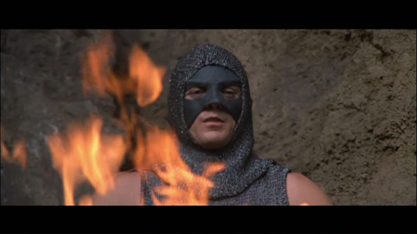 with their sights set on one governed by the mysterious "sacred flame" that can supposedly imbue the power of immortality. There we have our trio of superheroes -- Aru (Canti), Moog (Hannibal), and Chung (Shaw Brothers star Hua Yueh from Come Drink with Me and The Water Margin), who get into lots of comical fights for no good reason. The "immortal" village leader, Dharma, turns out to be quite a scam since it's really a string of guys donning the same mask and pretending to live forever, with Aru picked to be next in line. Once the amazons show up, it's a free for all to see who will come out on top.