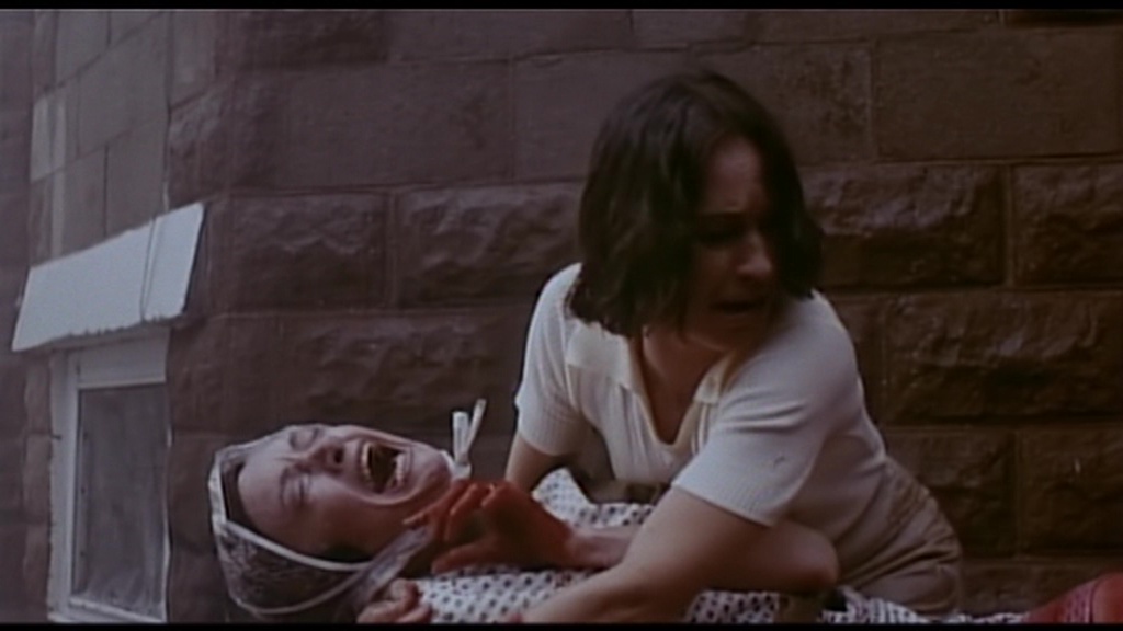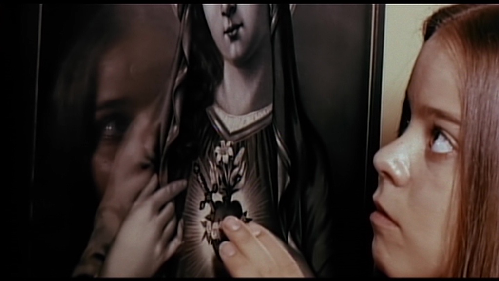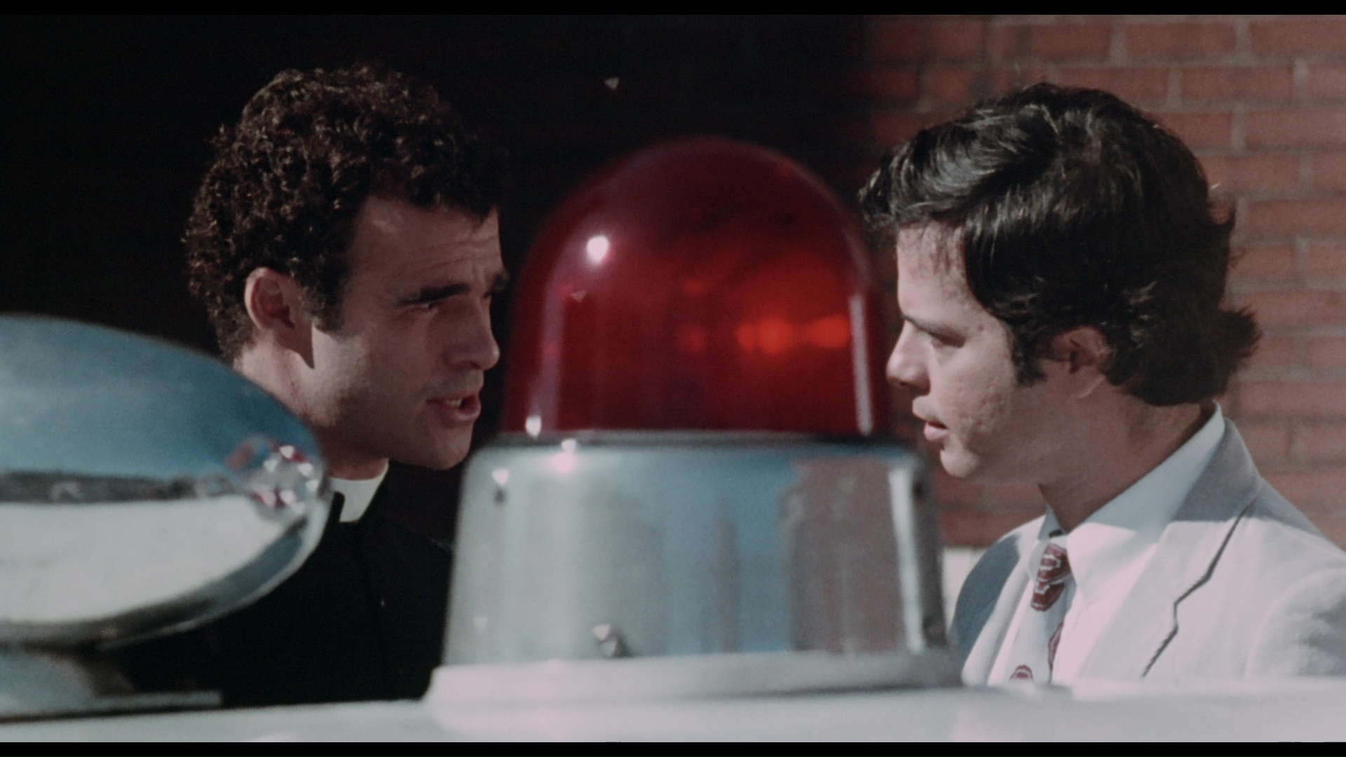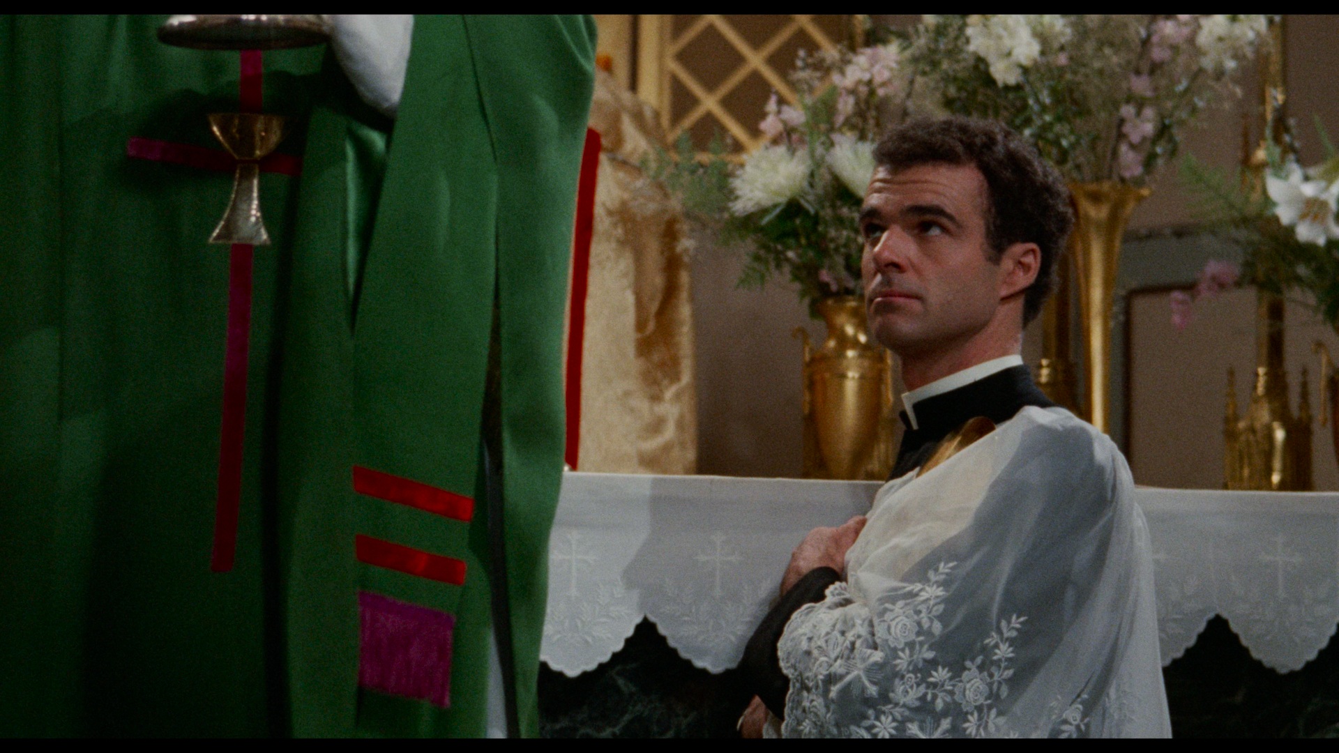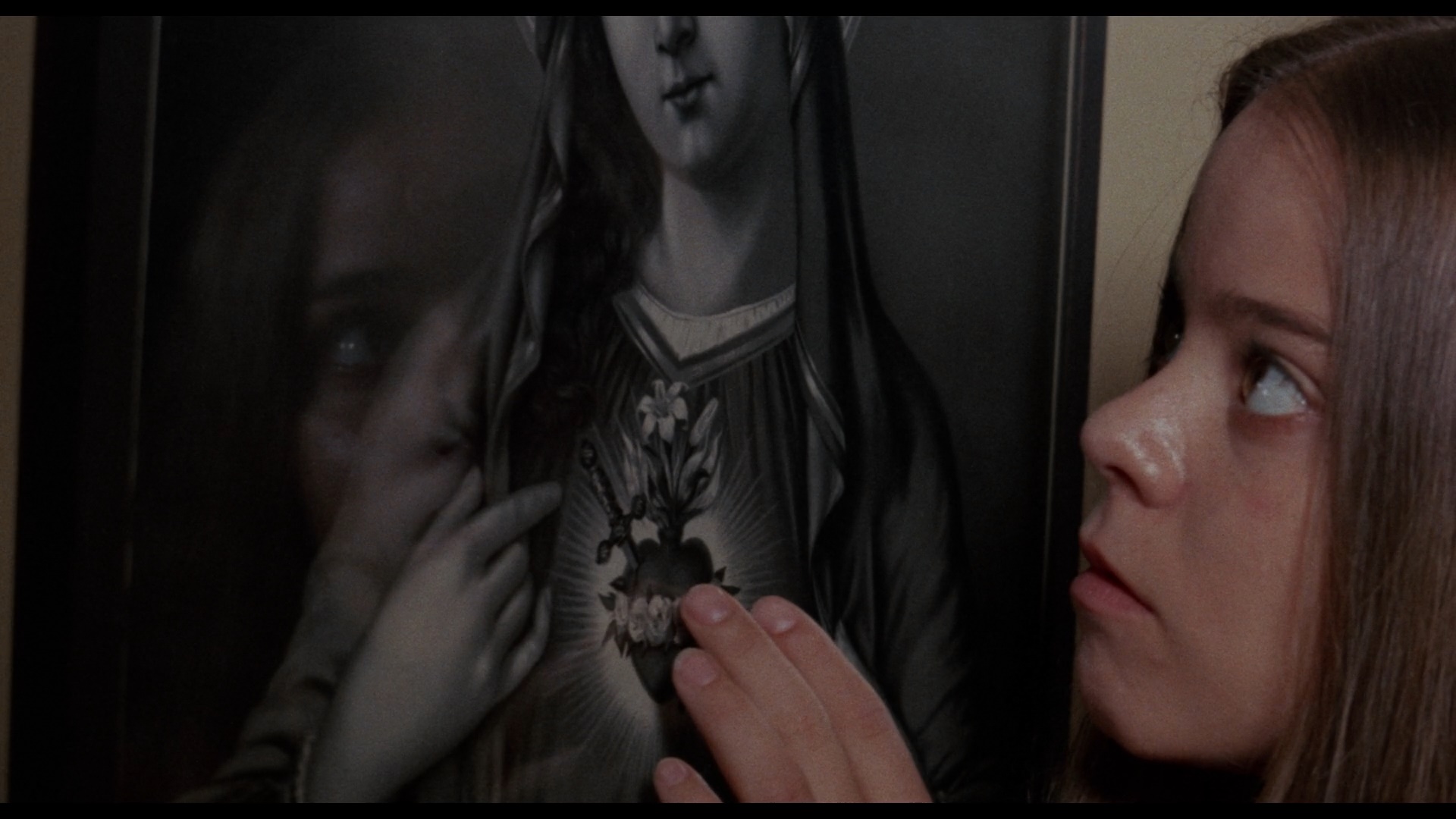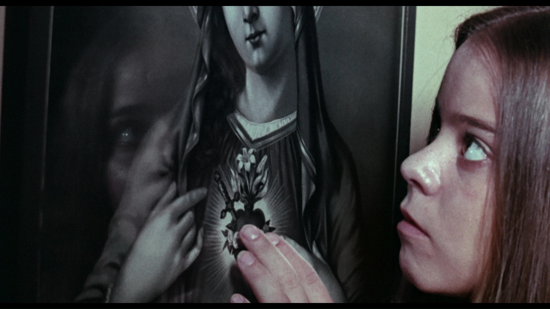 natural flesh tones. It's really a remarkable upgrade and proof that this film is as stylish as anything else turned out around that period. The LPCM English mono track (with optional English SDH subtitles) is also clearer than ever before, giving more range to the music and finally dispensing with that harsh, distressed sound to the dialogue recording. The preexisting Sole/Salier commentary is ported over here, but you also get an excellent, thorough new track by Richard Harland Smith, who presents an overview of the film as a significant genre entry and a key piece in the careers involved from Shields to Sole himself. He does a fine job of balancing historical trivia with insights into the film's status as a regional horror landmark (thanks to its shooting in Paterson, New Jersey) and a number of odd or mysterious elements in both its themes and production details, not to mention its strong ties to the theater community. A new interview with Sole, "First Communion" (18m42s), covers his movement into directing including his very controversial debut film and charts the development of the story, the arrangements with Paterson to get the film funded and produced, and the background of some of the players. (DeNoble's is a doozy.) For some reason there's a ton of heavy digital filtering on Sole during his interview footage, but it's well worth checking out and includes a barrage of great vintage newspaper clippings to boot. "Alice on My Mind" (14m59s) with composer Stephen Lawrence is a fascinating peek into how he built the various themes to the very memorable score (with live piano demonstrations), with plenty of background information included about his musical career, too. In his first extra ever for one of his films, McMaster appears for "In the Name of the Father" (16m2s) for a Skype chat about his background, his entry into acting after military service and other unrelated careers, the mechanics of his most memorable scene, Miller's turbulent divorce from Jason Miller, and a fair bit about his role in that other notorious horror film just after this film (apparently under yet another title in the beginning, The Horrors of Dr. Sardu). His thoughts on Catholicism and Sole's attitude at the time are quite fascinating as well, and again, keep an eye on the newspaper clippings (including one announcing this as a made-for-TV project, weirdly enough). Then "Lost Childhood: The