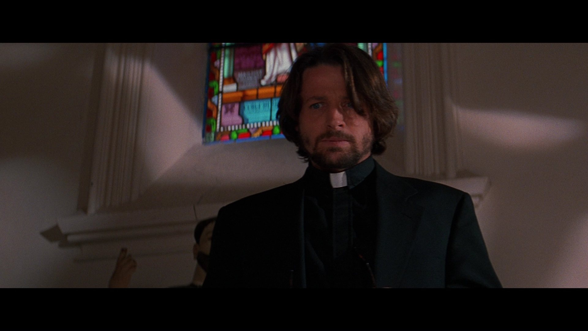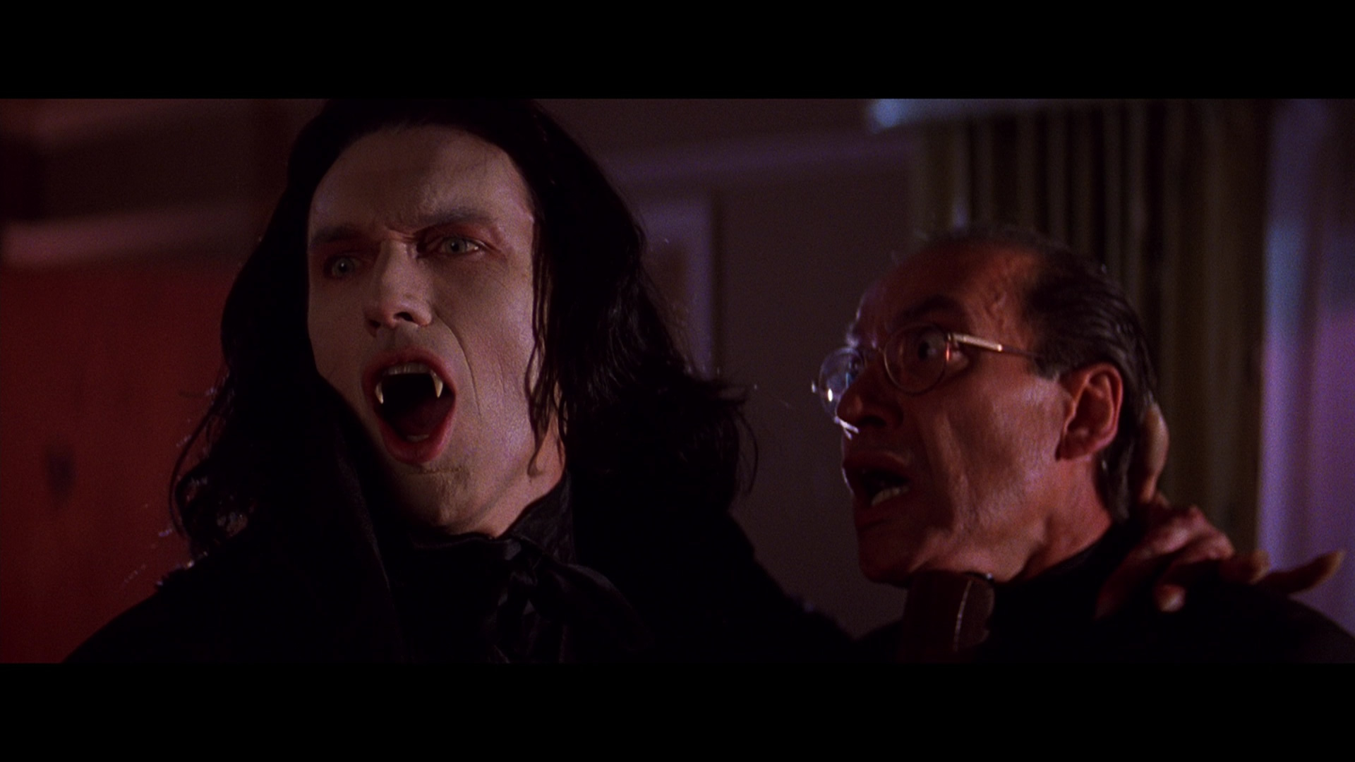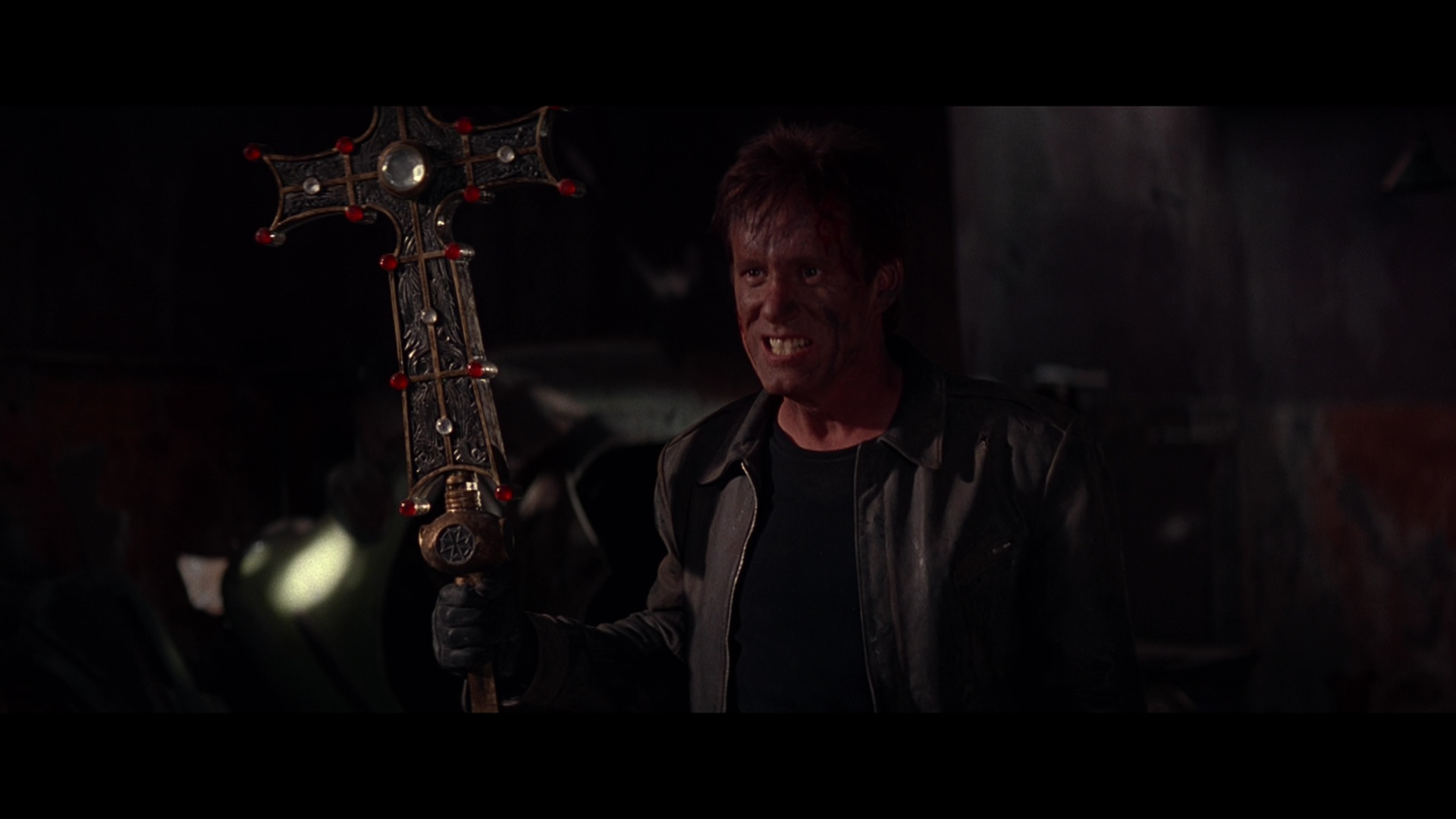 In 2016, Vampires made its UK Blu-ray debut from Indicator in a greatly expanded, dual-format special edition that will likely remain the final word on the title for quite a while. The transfer appears to be derived from the same master, but a more generous and sensitive compression job results in a perceptible uptick in detail as well as a more natural sense of film grain texture. It's more evident in motion, but here's a sample grab from the Twilight Time disc compared to the first one seen above; the Twilight Time was certainly no slouch, but this release slightly edges it out. Both 5.1 and 2.0 options are present here (with updated and improved English subs) along with the commentary, isolated track, and making-of featurette, but a substantial amount of new material is added as well. The theatrical trailer finally makes its appearance here, along with 9 minutes of B-roll footage, a 9-minute sample of interviews (with Carpenter, Woods, Baldwin, and Lee), and part one of The Guardian interview with Carpenter (38 mins.), from the director's Q&A with Nigel Floyd at the National Film Theatre in 1994. Obviously he doesn't discuss this film since this was held around the time In the Mouth of Madness was released, but it's a fun chat as he covers his career up through 1983 with stories about everything from Dark Star and UCLA to his much-loved Kurt Russell classics. As usual Indicator leads the field in liner notes booklets with a beautiful insert featuring an essay by Kim Newman (who does a good job of contexualizing the film's treatment of vampire lore while placing at the forefront of the following decade's wave of vampire multi-title sagas and assessing this film's strengths and cons) and a 2015 Carpenter text interview from Filmmaker about casting Woods (who got to do an improvised take of his scenes after performing them as written), the amusing cameo by Frank Darabont, and his thoughts on the major home video resurgence of his work.