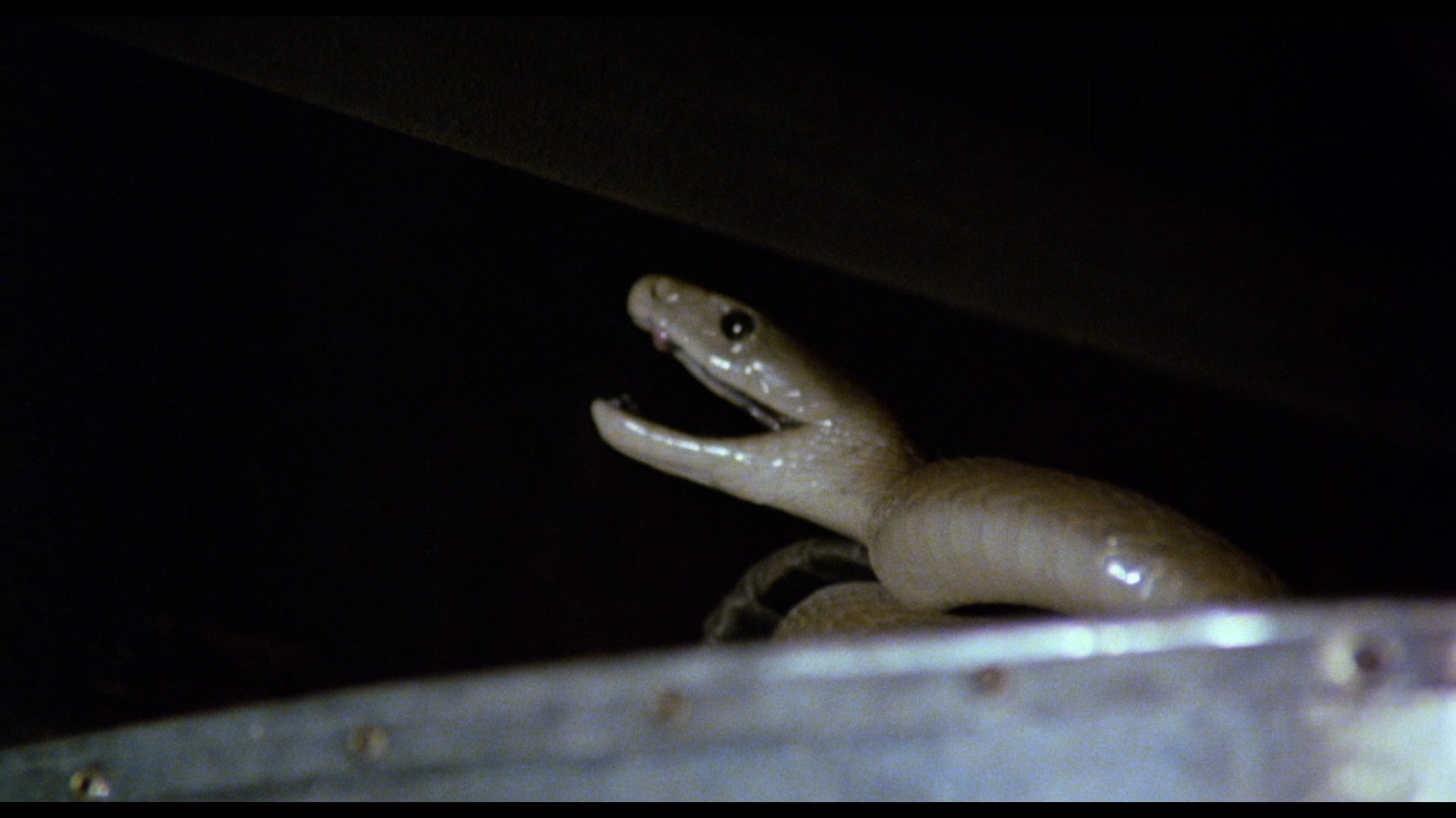 Usually seen on cable and via Vestron's ugly VHS transfer for its first two decades of video life, Venom finally got a watchable presentation thanks to Blue Underground's DVD in 2003. The image quality was solid, with vivid colors and accurate framing (similar to but more polished than the earlier no-frills Australian release). Both the 6.1 DTS and 5.1 Dolby Digital EX surround mixes sound fine, with a 2.0 surround mix hewing closer to the theatrical mix; the snake attack scenes (complete with occasional POV shots, no less) benefit the most from the audio overhaul, but the nice early score by the late Michael Kamen gets a solid boost as well. Haggard appears for an enjoyable but low-key commentary track with moderator Jonathan Sothcott, covering all of the bases including his dissatisfaction with Hooper's footage, the multiple rifts between actors, and the difficulties of mounting such a complicated production on limited means. Other extras include the theatrical