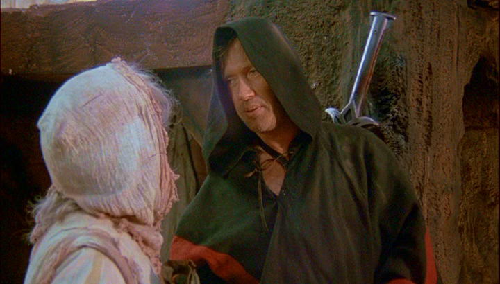 However, it's the hammy supporting characters here who are the real show, with all of the actors (most weirdly dubbed in post-production for some reason) acting as strangely as possible among the cheap desert sets. Select doses of previous Corman scores (including some recognizable snatches of James Horner music) add more color to an obviously threadbare production, and director John C. Broderick (best known for the drive-in trash favorite Bad Georgia Road) keeps things movign very quickly for the trim 81-minute running time. Of all the Corman sword films, this is certainly far from the worse and quite entertaining if you're in the right frame of mind. Shout Factory's disc (available officially through their Direct line, found at the link above) features an anamorphic transfer that's several huge steps ahead of the murky, washed-out Vestron VHS tape and the later New Concorde DVD which recycled an old one-inch tape master. This new transfer features some significant damage during the opening credits, but otherwise it's crisp and colorful with only some minor debris issues to speak of. It's obvious this won't be a Blu-Ray candidate anytime soon, but the upgrade value here is definitely substantial. The anamorphic framing also restores a lot of compositional style compared to the awkward, open matte versions we've had before.