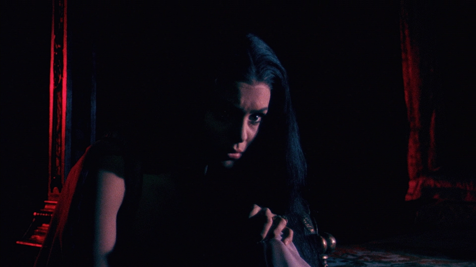 Now we jump ahead to 2013 with a Blu-ray release and DVD reissue from Kino Lorber as part of their ongoing Mario Bava line, and it's one of the few (alongside Hatchet for the Honeymoon) not licensed from Alfredo Leone. As you'd probably expect, right off the bat the transfer is yet another variant in the film's odd home video history and looks the closest to date to the Technicolor prints seen in most English-speaking territories. It's appropriately dark and rich with very crisp detail, causing the sparing but dramatic bursts of red and blue lighting to really pop off the screen. The frame grabs here are all from the Blu-ray, and while it really plays more beautifully in motion than a simple image can convey, it might at least give you some idea of what to expect. Most surprisingly, this is also one of the cleanest-looking Bava releases they've turned out to date, thanks to what appears to be a pristine French print (based on the opening credits). The 1.78:1 framing also adds a significant amount of information on the sides compared to the German disc, especially at the bottom. The PCM mono audio is presented in English, Italian and French with optional English subs translated from the Italian version, and Tim Lucas' commentary makes a welcome return and still holds up just as well. Additional extras include the French trailer for the main feature (looking pretty dupey as always) and bonus previews for Black Sabbath, Baron Blood, Bay of Blood, Lisa and the Devil and House of Exorcism. Bava hasn't exactly had the smoothest history on Blu-ray to date, but you can easily file this one among the winners and rank it as the most satisfying, impressive presentation of this often mistreated macabre gem to date.