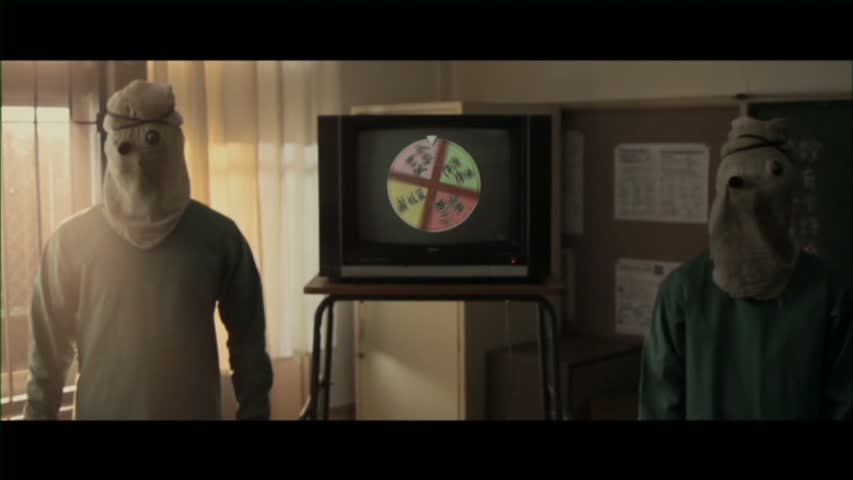 creepy computer torture video and other uncanny events soon tip them all off that something's amiss, and soon the couple and two of their old friends find themselves trapped in that same classroom, a recreation of the one from their childhood. Two creepy psychos in green surgical smocks with bags over their heads enter the room and, armed with taser rods, force the quartet to participate in an increasingly sadistic string of "games" determined by the box. A "school lunch" (consisting of rice and maggots), forced milk chugging, a "pencil guillotine" ca