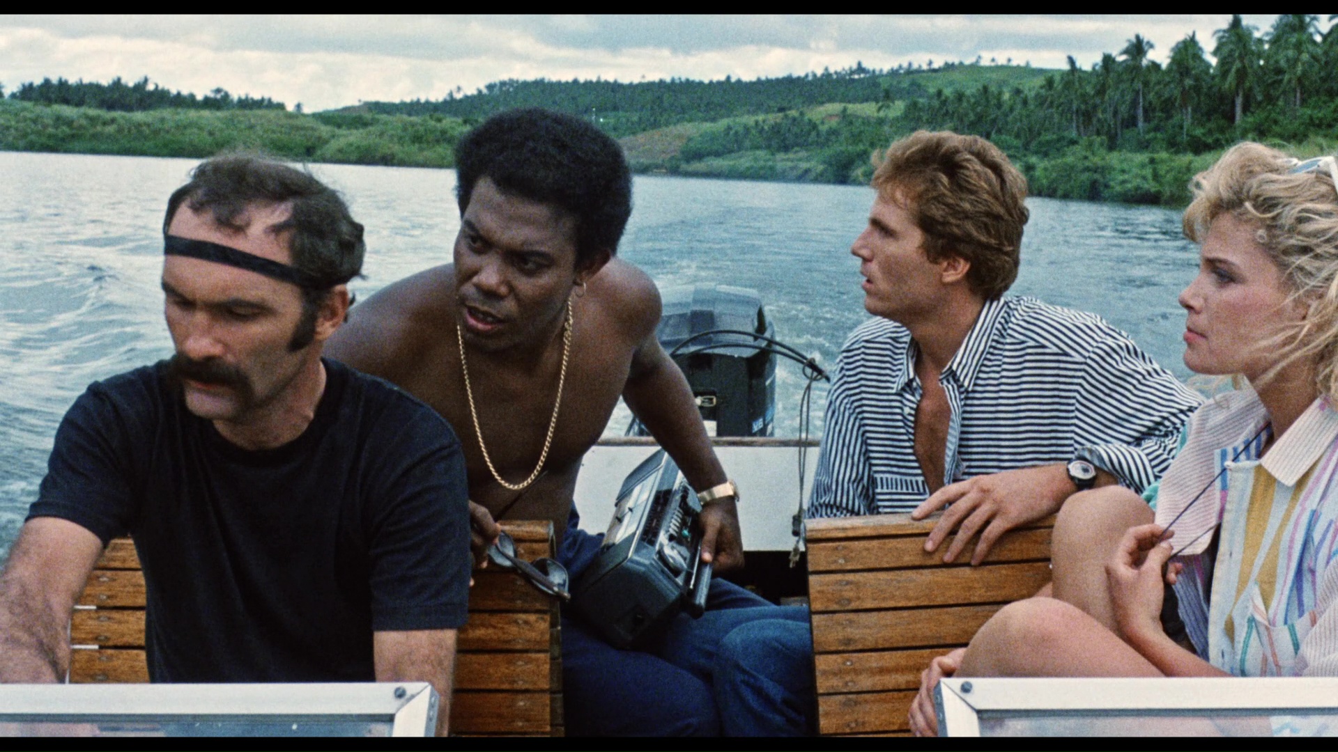 The goofiness begins full throttle in the obligatory opening set piece, which finds a hyperactive voodoo doctor fending off a gang of white interlopers by turning his drooling, zombie wife loose on them. The sole survivor returns two decades later as pretty Candice Daly, who for no particular reason tags along with a band of mercenaries led by the stoic Chuck (switch-hitting porn star Jeff Stryker, billed as "Chuck Peyton"). Of course, she isn't aware that this is the same island of doom until it's too late when they're all besieged by the hungry undead. Our heroes run into a band of inept scientists who have accidentally increased the zombie population, resulting in a claustrophobic voodoo showdown strangely reminiscent of the "magic circle" bit from The Devil Rides Out, only sillier. Eventually it all comes down to a handful of survivors and an ultra-moist finale "borrowed" from the "other" Zombi 3, Burial Ground.