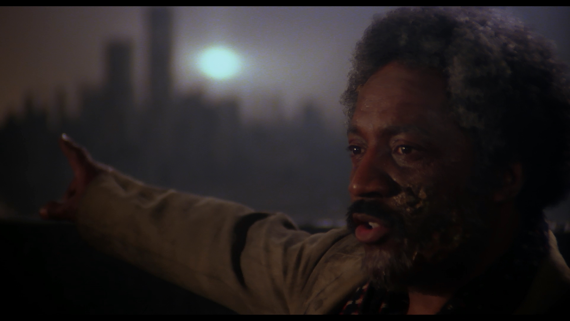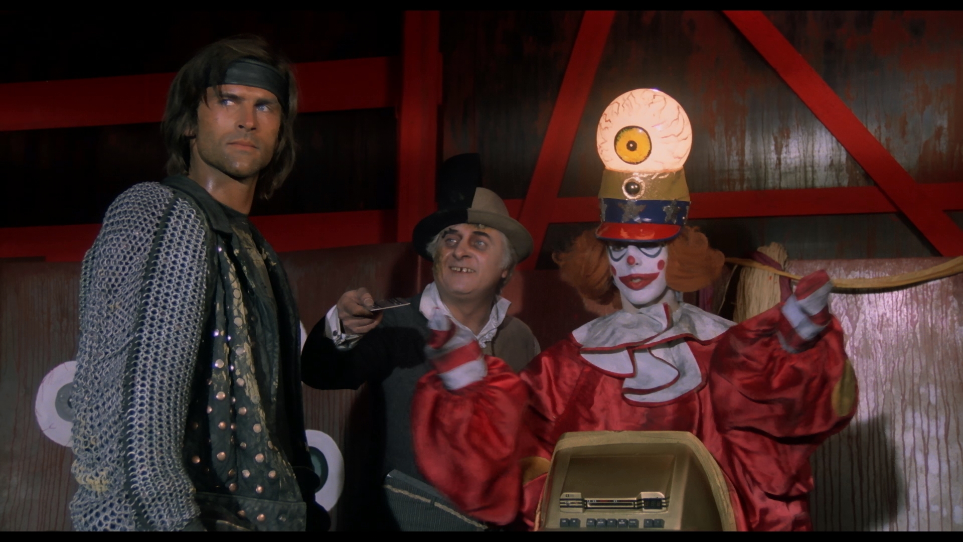 (10m20s), "Future Is Now," speaking in Italian with English subtitles about working with both Sergio and Luciano Martino including learning all of her English dialogue by heart despite the "Babel" feeling on set and working inside the wild futuristic sets. His comments about the film's matte painting of the Twin Towers are especially fascinating and poignant, too. The always colorful Eastman gets a fairly low-key interview for him out of his batch of Code Red featurettes, as "Meet the Apeman" (5m37s) finds him speaking positively of both the finished product and working with Martino even if he was "distant." In "Hook Man" (20m31s), Scalondro gets an extensive opportunity to cover his dramatic career in Rome, the challenges of trying to work with a hook hand and convincingly gouge out someone's eyes, and his motorcycle skills that came in handy during the shoot. Finally, set designer Massimo Anotello Galeng gets his turn in "Welcome to the New Middle Ages" (11m21s) explaining how he aimed to bring a "metaphysic abstraction" to the film by combining futuristic elements with the medieval past. Shortly after the Code Red release the film also hit UK Blu-ray and DVD from 88 Films; that edition is not available for review at this moment for comparison, but it features different interviews with Martino, Galeng, and a joint one with Galeng and Ginacarlo Marin.