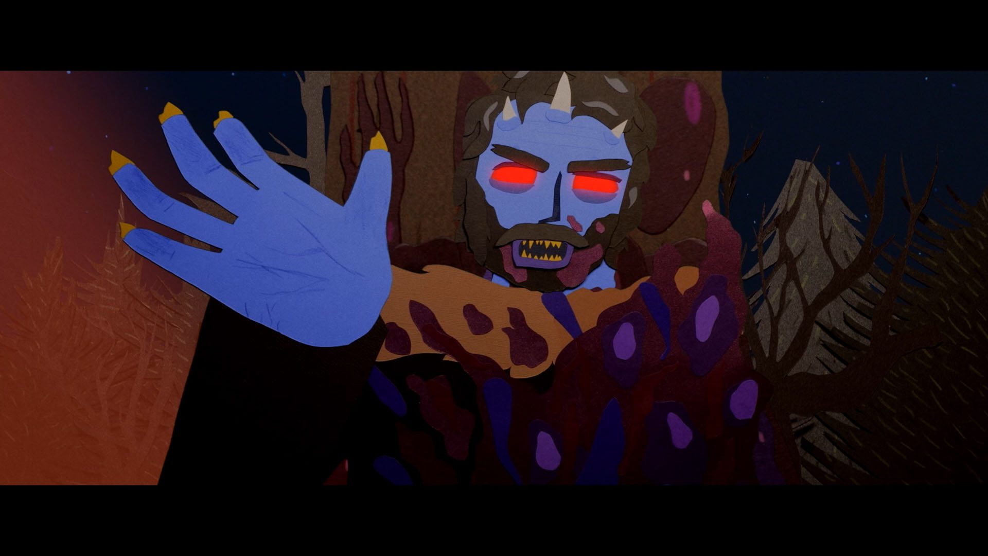 way to go with the score in particular having more depth. (It's worth noting the packaging indicates this is a Region A disc, though it played fine on a player set to Region B as well.) Power and writer Andreas Petersen (recorded separately) provide the first audio commentary talking about the cut-paper, stop-motion animation technique, the nature of the freelance animation business, the integration of horror and other pop culture references, the dialogue recording process, and the challenges of mounting the production with participants around the U.S. A second track with Dread Central's MaryBeth McAndews and Gayly Dreadful's Terry Mesnard focuses on their podcast connection to the filmmakers, their impressions of the final product, their enthusiasm for animated carnage, and the horror nods peppered throughout the story. A comedy commentary from ScoffTracks’ Lucas Taughn is exactly what it advertises, an arch Rifftrax-style series of reactions that would probably work better if the film audio had been mixed in. "Demons for Days" (11m19s) is a short making-of featurette with Power serving as your narrator guide through the years-long evolution of the film from concept pitch through completion, including a peek at some of the animation elements and some more details that didn't make it into the commentary. Also included are a proof of concept video (1m42s) highlighting the characters with scratch narration, a Teek "Sleeping Trees" music video, the trailer, and bonus trailers for Mother Schmuckers, The Passenger, Fair Game, and Missing.