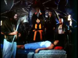 The more famous of the two, Bandh Darwaza ("Closed Door") is a colorful, deliberately kitschy, violent vampire saga, with bloodsucker Neola entering an unholy pact with an expecting mother who promises her newborn if it's a female. Not surprisingly, mom has second thoughts and sends her husband to dispatch her partner in evil; however, faster than you can say Dracula, Prince of Darkness, the vampire is resurrected eighteen years later to continue his quest for the promised maiden. Not surprisingly, she isn't too thrilled with the prospect of becoming a bride of the undead, and her suitors and friends are packing up their gear for some rough-and-tumble monster hunting.