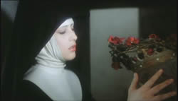 Despite the title and the consistent parade of exposed skin, Behind Convent Walls spends very little of its running time concerned with the nuns actually doing anything blatantly sinful. A couple of darkly shot softcore gropes are included, of course, and there's a showstopping scene involving a very blasphemous wooden self-pleasure device that's considerably more explicit than most audiences expected at the time. However, Borowczyk is more concerned with the playful eroticism bubbling beneath the women's habits that manifests itself in unexpected ways, as when gorgeous Marina Pierro (who went on to become the director's muse in several films after this) inflicts stigmata on herself with a bouquet of roses affixed to a crucifix. Apart from Pierro, the cast consists of several familiar faces from Italian exploitation including Howard Ross (New York Ripper) as a potential fox in the henhouse and a typically exhibitionistic turn provided by Olivia Pascal, star of Vanessa and Bloody Moon.
