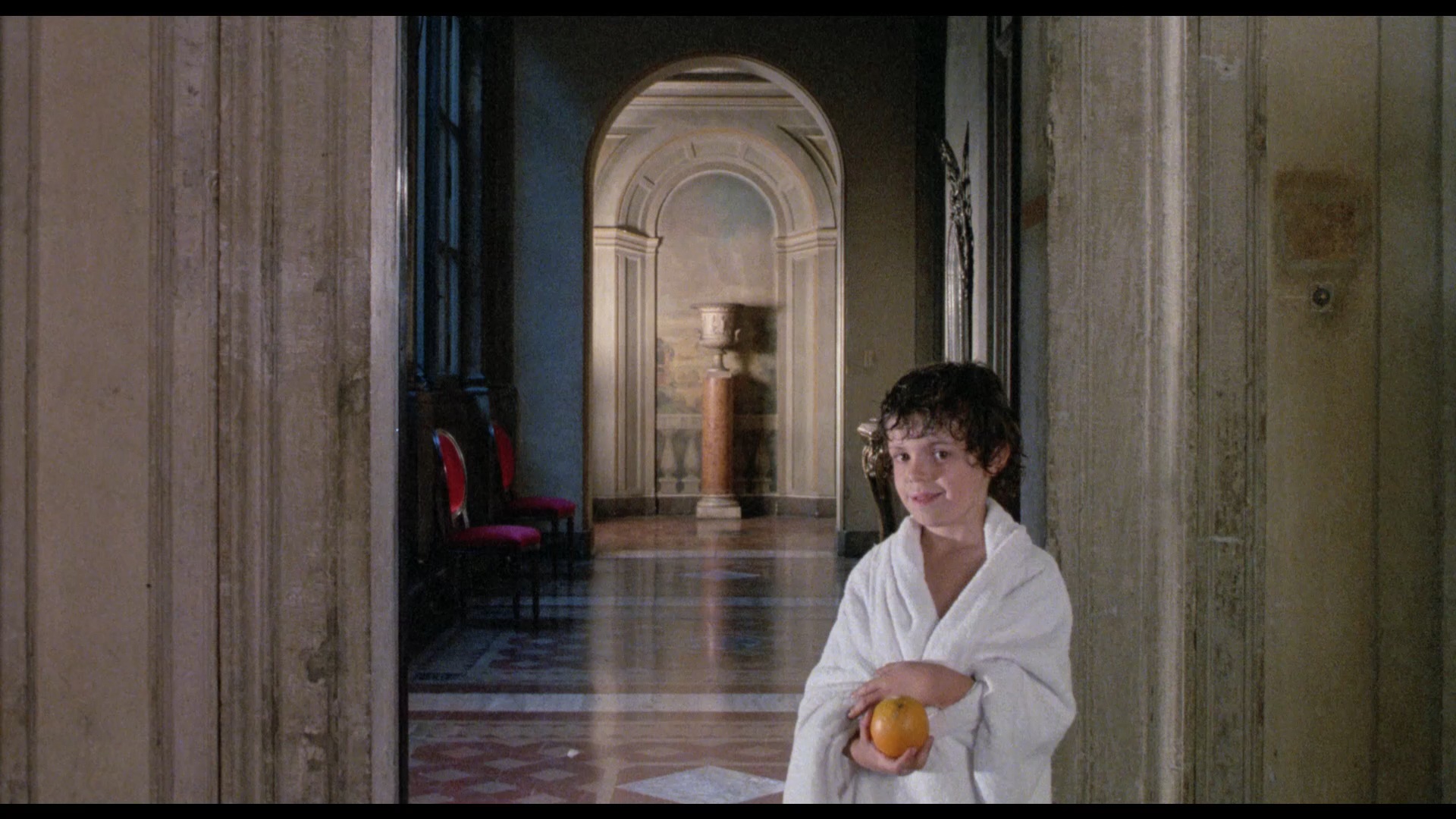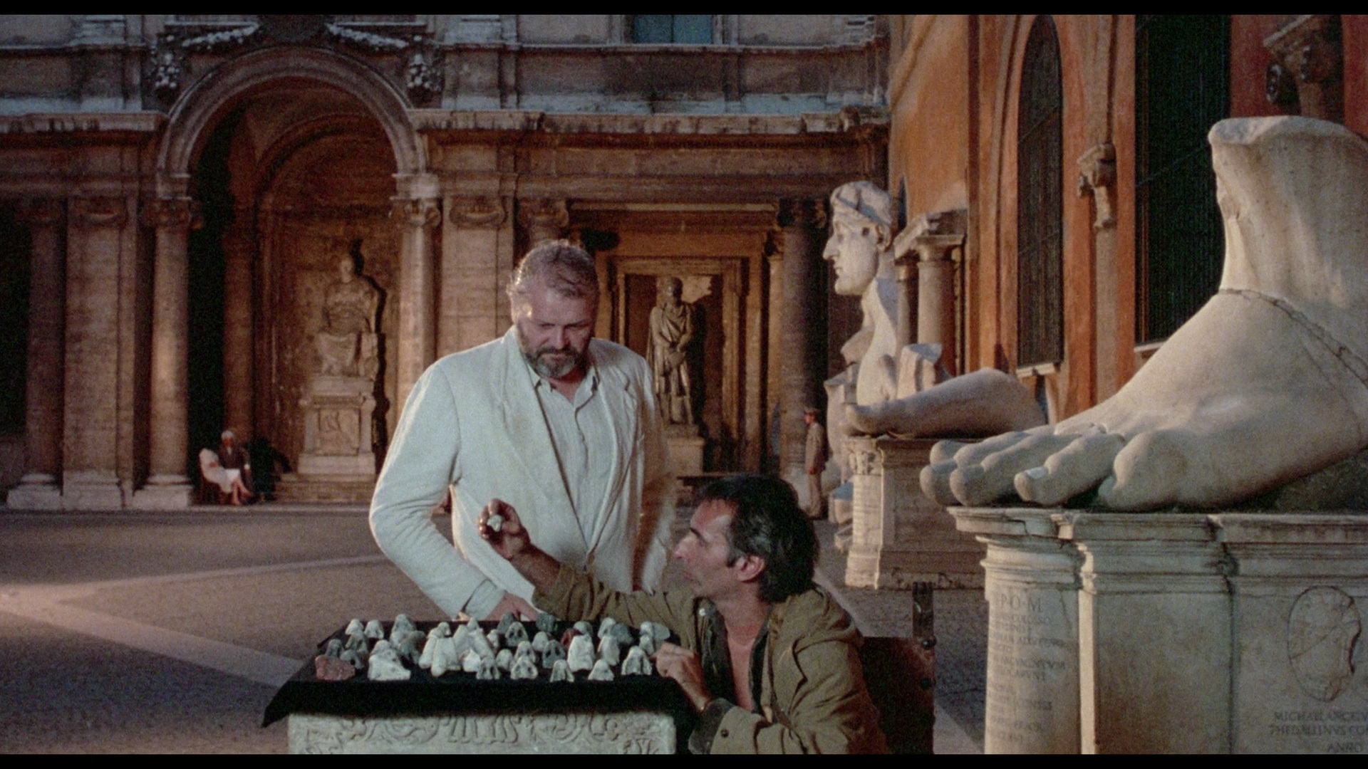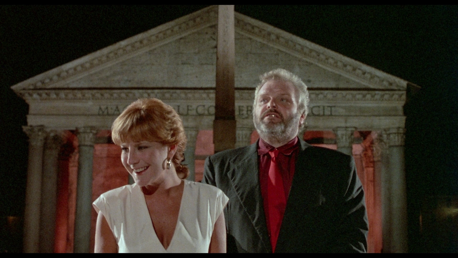 2K scan and restoration from the original 35mm camera negative. The prior HD presentation was already excellent so the difference here isn't tremendous, but the grain is managed better here and looks more natural while reds are more controlled and don't glow in a few spots like they do on the BFI (see fifth comparison grab below). The DTS-HD MA 2.0 English stereo track sounds as good as it always has with fine separation, and optional English SDH subtitles are provided. A new commentary track with Eugenio Ercolani and Greenaway obsessionist Tony Strauss covers everything you could possibly want to know about the production including Greenaway's reasons for distancing himself from it in later years, the numerous ties to his other films, the Italian production crew involved, the themes of architecture and the body, the merits of the score, and tons more. In "Stately Progress" (18m3s), still-busy editor John Wilson chats about his career path that led to the COI at the same time with Greenaway, the move to features with Draughtsman, working out the themes to this film upon seeing the footage which he couldn't see until it was all finished, the role of fine arts and especially drawing in this film and their others, and his overall working process with Greenaway which continued through Cook. "Caput Mundi" (28m31s) is an intriguing interview with architect Gianpaolo Ercolani (and some photogenic cats) about Greenaway's evolving relationship with Rome and its surroundings, his own introduction to Greenaway via Draughtsman, the boldness of casting Dennehy, the conceptual trademarks of Étienne-Louis Boullée's architecture, the heavy number of pick-up close shots done later in England, the doctrines behind the discipline, and the role of signature buildings here like the Pantheon. An insert booklet features an essay by Scout Tafoya, "The Cenotaph and Cake," placing this film in context with Greenaway's oft-stated theories about cinema and the ways one of its central architectural images reflects on the larger purpose of the story.