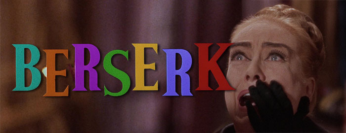 glorious Technicolor in the 1960s, it was inevitable that someone would think of combining it with that most colorful of spectacles, the circus. Cecil B. DeMille's Oscar-winning The Greatest Show on Earth (and, to a much lesser extent, the John Wayne vehicle Circus World) proved that audiences would be happy to plunk down money to watch daring feats and eye-popping animal performances, so why not throw some screaming and bloodshed into the mix? In fact, multiple people had that idea, starting with the gruesome 1960 hit Circus of Horror and followed by 1966's krimi-ish Circus of Fear. Columbia Pictures got in on the act with the biggest entry in that short craze, Berserk, headlined by a deliciously dramatic Joan Crawford and delivering a fair amount of grue for a major studio picture. Something diabolical is going down at the colorful Great Rivers Circus whose owner, Monica (Crawford), is contending not only with defecting staff but the gruesome deaths of some of her performers -- right in front of the audience. On top of that her precocious daughter, Angela (Geeson), has come back after being kicked out of school, and a fledgling romance forms thanks to the new presence of mysterious stud Frank Hawkins (Hardin), a trapeze artist with no agent or apparent past. When she isn't busy