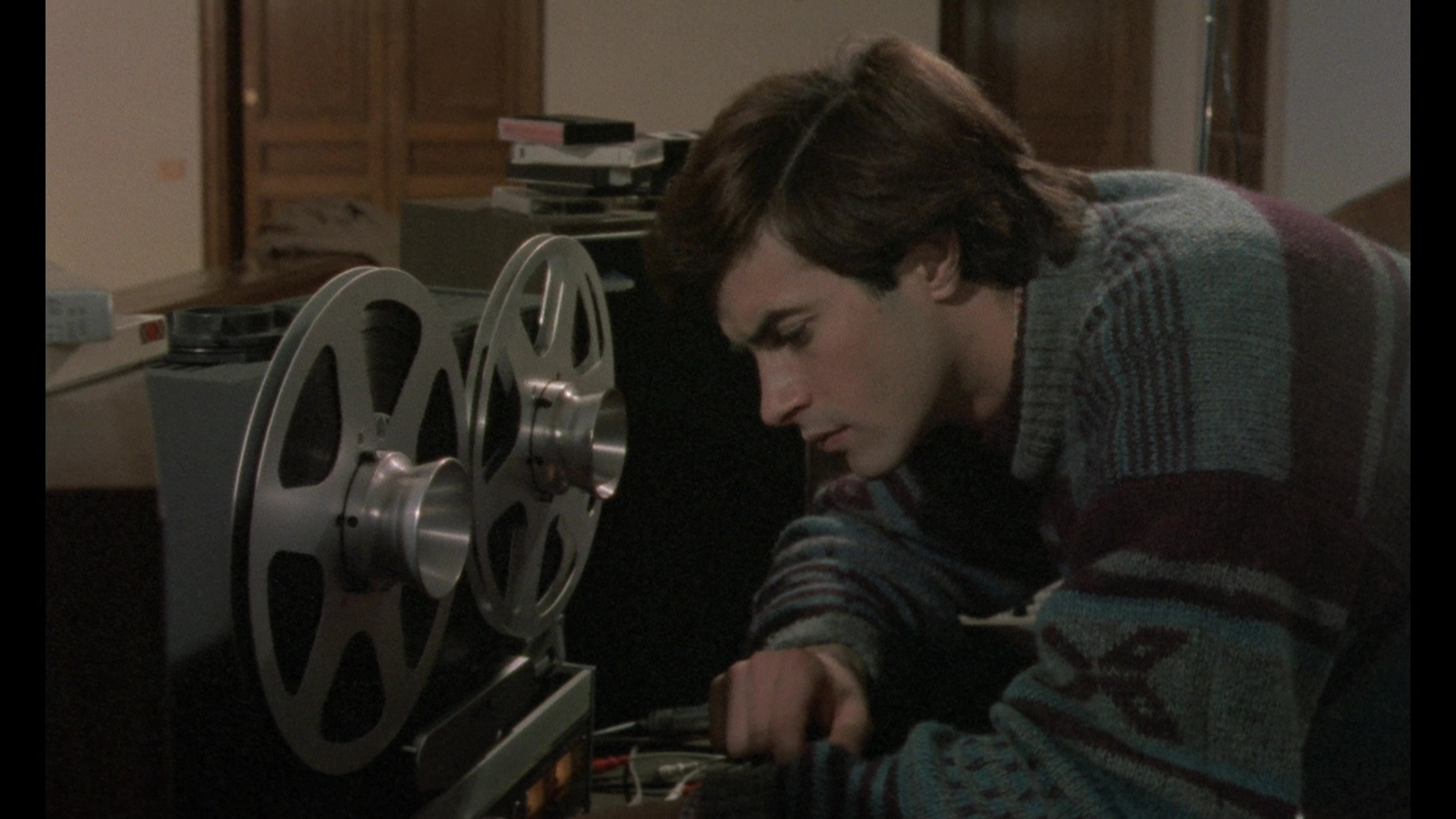 "Don't Go Down the Stairs" (16m34s) is a new video interview with Lamberto Bava covering Luciano Martino's formidable status as a producer, an aborted project before this that went to Fulci, the edict to have a killing in this one every 20 minutes, the budgetary constraints of the production, and casting Soavi in his young actor days. In "House" (20m54s), screenwriter Dardano Sacchetti talks about the origins at Dania Film (subtitled as "Dagna" here for some reason), the pivotal villa location that drove much of the story, other ideas he played around with, and the financial risks (or lack thereof) making genre films around that time. "Lights in an Empty House" (16m41s) features cinematographer Gianlorenzo Battaglia looking at the very busy state of Italian cinema around '83, his path to becoming a director of photography, his working relationship with Bava and positive impressions of Soavi, and his methods for creating visual atmosphere lighting up the villa from top to bottom. Finally Samm Deighan studies "The Gothic Slashers of Lamberto Bava" (17m25s) from Bava's birth to genre cinema royalty through his work under Mario on numerous films and finally his auspicious debut with Macabre and cross-pollination of slashers, gialli, and supernatural elements from that point onward. Also included on that disc are the Italian and English trailers. The other Blu-ray featuring the theatrical cut also ports over the "Behind the Blade" featurette from the Anchor Bay disc and also adds All the Colors of Giallo (89m1s), Federico Caddeo's documentary also available as part of a three-disc set from Severin Films from 2019. The very stylish and impressive packaging also comes with a 40-page book featuring new essays by Caroline Kopko, Alexandra Heller-Nicholas, and Dana Reinoos.