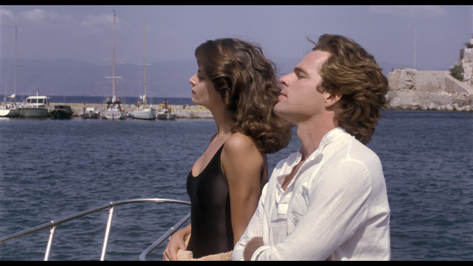 That said, Mastorakis' penchant for fiddling with filters and other video chicanery is still in evidence here; the worst-looking segment of prior releases (an early bit with Bottoms walking around Athens wearing a stunning "I Love My Dentist" shirt) looked like it was on the verge of collapsing before, and it's pretty rough here for some reason. (Compare the second frame grabs below.) That means the inconsistency you see here is likely how the master was delivered, so take it for what it is. The 5.1 remix is presented here along with a more satisfying 2.0 stereo version, both DTS-HD MA. The shorter theatrical cut is also included (1.78:1 widescreen) in standard def from a very dated, shaky source and doesn't make for terribly enjoyable viewing. The "Films of Nico Mastorakis Part One" video is carried over here along with the two music videos, and you also get a different (and very spoiler-y) trailer as well as the older DVD and VHS versions and a bonus one for Nightmare at Noon. New here is a lengthy still gallery (5m34s) complete with the entire, NSFW cast photo spread published in Playboy.