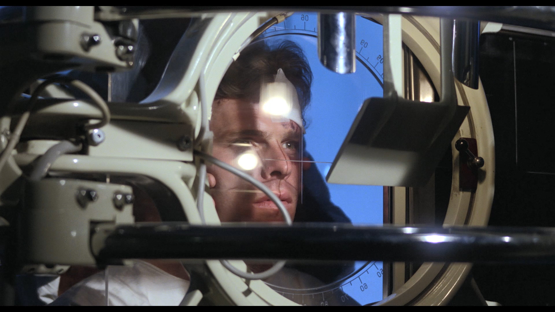 and former flame (maybe, it isn't exactly clear) whom he saved from a gang attack at some point in the past. Now he keeps stalking her at night, only to be spotted while she's having a parked session with Dave (Daughton) that results in a foot chase with Jonathon running smack into a tree. Suddenly our peeping tom is afflicted with a case of hysterical blindness that can only be alleviated by fluffy-haired Dr. Steiger (Dullea), who whips up some microchip brain alterations that allow Jonathon to see the computerized outlines of his surroundings by, uh, wearing his Walkman. As it turns out, Jonathon has also crossed paths with the serial killer whose list of victims starts to hit dangerously close to home. Oh, and don't forget: "Jonathon Ratcliff will return in Run, Stumble and Fall."