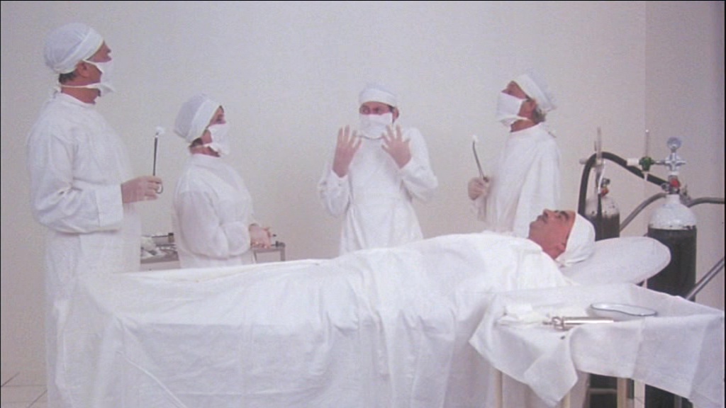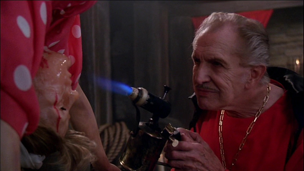 making Bloodbath one of the few happy exceptions. Some of the jokes are still a little too inside to work for many modern viewers, but the tried-and-true horror gags (especially a wild, gory flashback involving a surgery gone horribly wrong) still make this a top-notch cult item. Everett's hit-and-miss performance is a rather iffy way to ground a film, but fortunately he's carried along by a stellar supporting cast including the always-funny Pamela Stephenson (another TV comedy vet best known to US viewers as one of the few good things in Superman III) and The New Avengers' Gareth Hunt, who plays one-half of a gay paranormal-investigating couple. The effects are surprisingly good for the most part, ranging from some Savini-worthy blood gags to ambitious visuals involving a feisty poltergeist, and the imaginative music score by Mike Moran and songwriter Mark London is dead-on brilliant. Of course, the biggest ace in the hole here is the presence of Price as "the Sinister Man," making the most of his limited screen time with some delicious speeches and wonderful nudgings at his classic AIP horror days. The whole thing's more than a bit disjointed and will never be mistaken for high art, but as a late night party selection, it fits the bill just fine.