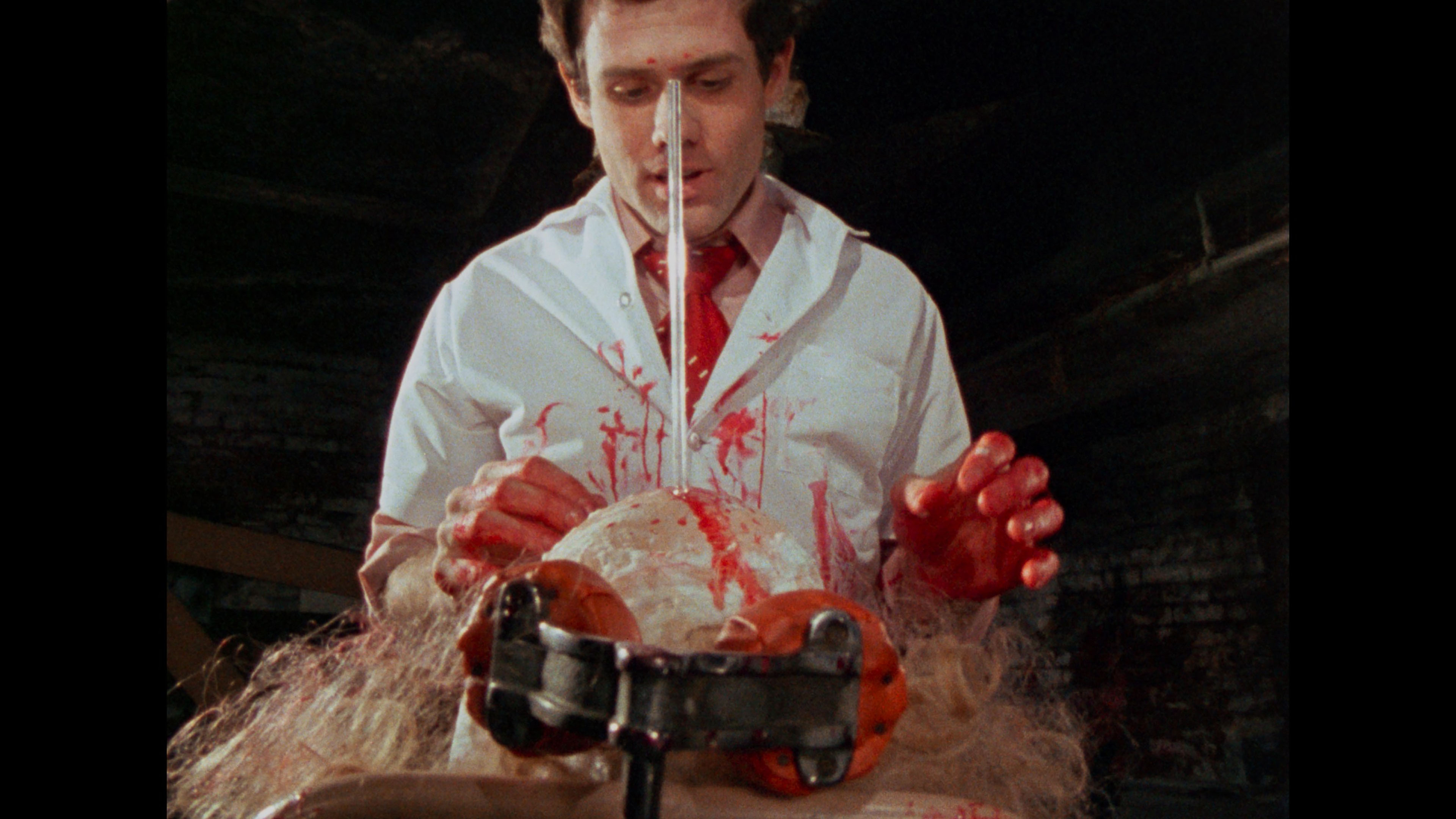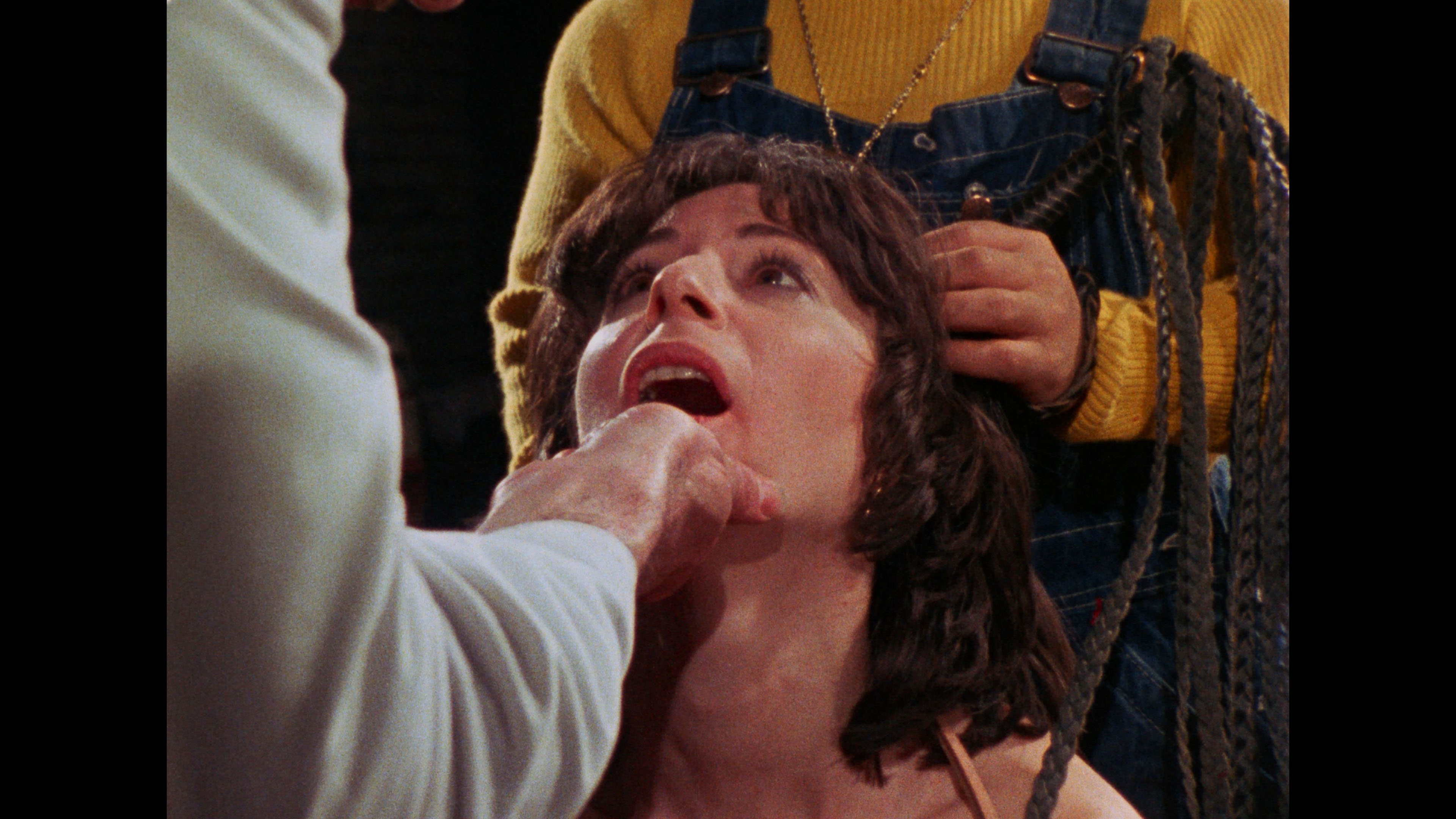Vinegar Syndrome gave the film its inevitable upgrade to 4K UHD with a two-disc set also featuring a Blu-ray with additional extras. We may not have 4K editions of Seven Samurai or Gone with the Wind, but at least we finally have a pristine 4K edition of Reed's grubby classic in our hands. The presentation (with HDR on the UHD and transferred from the 35mm internegative, the best element around) is back to 1.33:1, a welcome gesture as it's far better composed that way and no longer squeezed, and the leap in quality is drastic with rich black levels, much more natural skin tones, and finer detail throughout. This is also the extended cut (including the Sardu, Master of the Screaming Virgins title card), with the restored scene now immaculate (see the second frame grab comparison below) and matching the rest of the film. In addition to the Roth commentary, you get a terrific new commentary track by John Szpunar, author of Blood Sucking Freak: The Life and Films of the Incredible Joel M. Reed, who offers a packed history of the film from its outgrowth during the development of another unrealized project called Teen Demon, the financing process, the inspiration of a real S&M ballet performance, and wild stories about nearly every single cast member. Absolutely essential listening, especially if you're a fan of the film. "Freaks Come Out at the Drive-In" (14m31s) captures highlights from the Troma-Thon 2023 screening of the film at the Mahoning Drive-In Theater in Lehighton, PA, including an interview with Lloyd Kaufman about the film's distribution history and its success as a midnight movie title along with the real and fake women's rights protests. A full live commentary (93m37s) captured on VHS from a 2009 screening features Reed, Art Ettinger and Ken Kish, plus an intro by Reed, with lots of loose and funny stories from the shoot all the way through. The audio quality is hit and miss since Reed tends to mumble and the movie audio is fairly loud, but it's a priceless record to have for sure. A colorful screening Q&A with Reed (55m9s) has him answering questions at length in a movie theater lobby and on a stage, while a "random hotel room interview" with Reed (24m39s) from his Cinema Wasteland appearance lives up to its name as he takes a weird phone call, talks about doing conventions, and ruminates on his career. Ported over from the earlier releases are Kaufman's intro (2m36s), the archival cast and crew interviews by Roth (3m52s), the Roth interview (20m11s), and the Chris Jericho interview (14m36s), plus the reissue Blood Sucking Freaks main titles. VINEGAR SYNDROME (UHD)