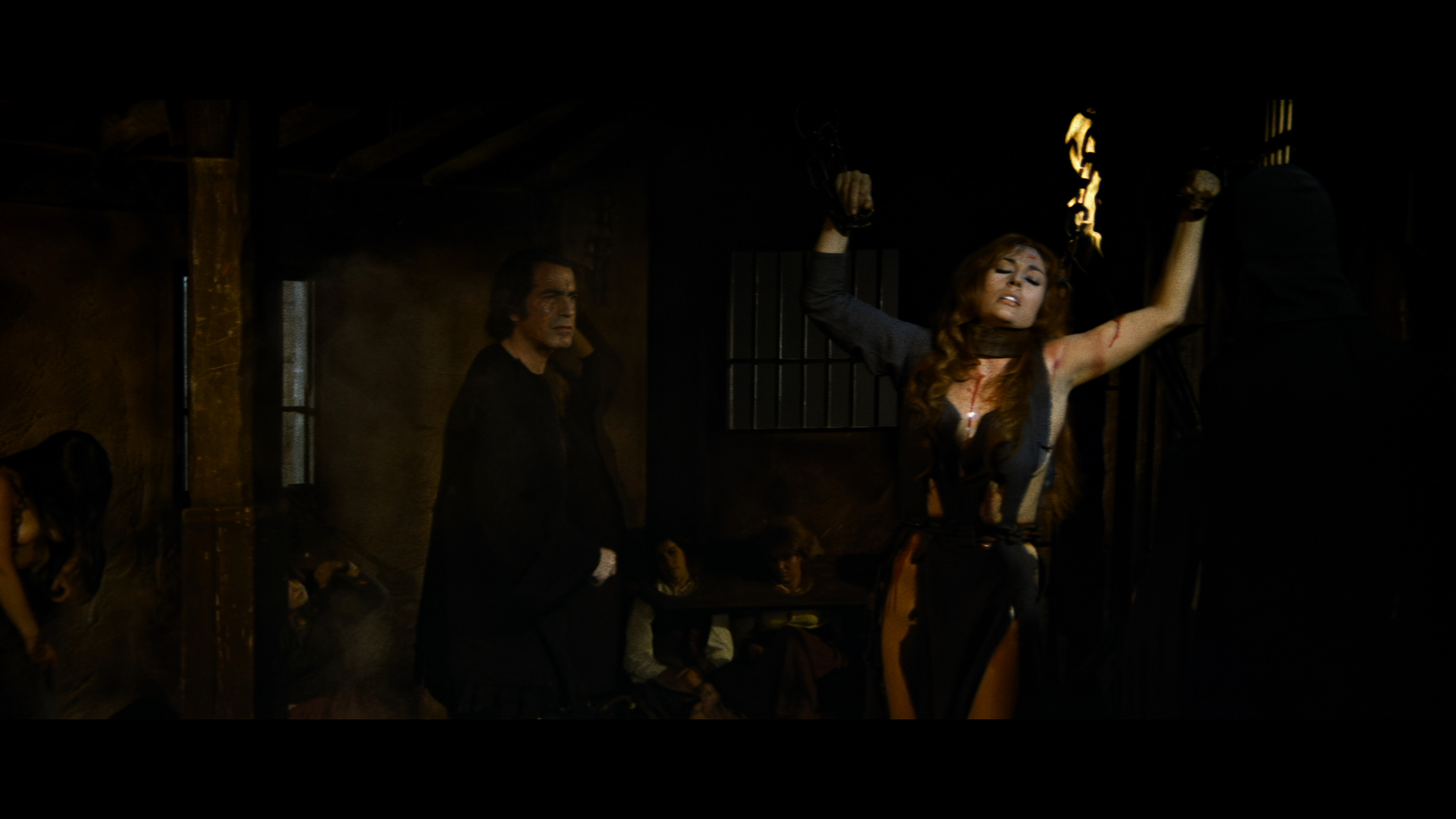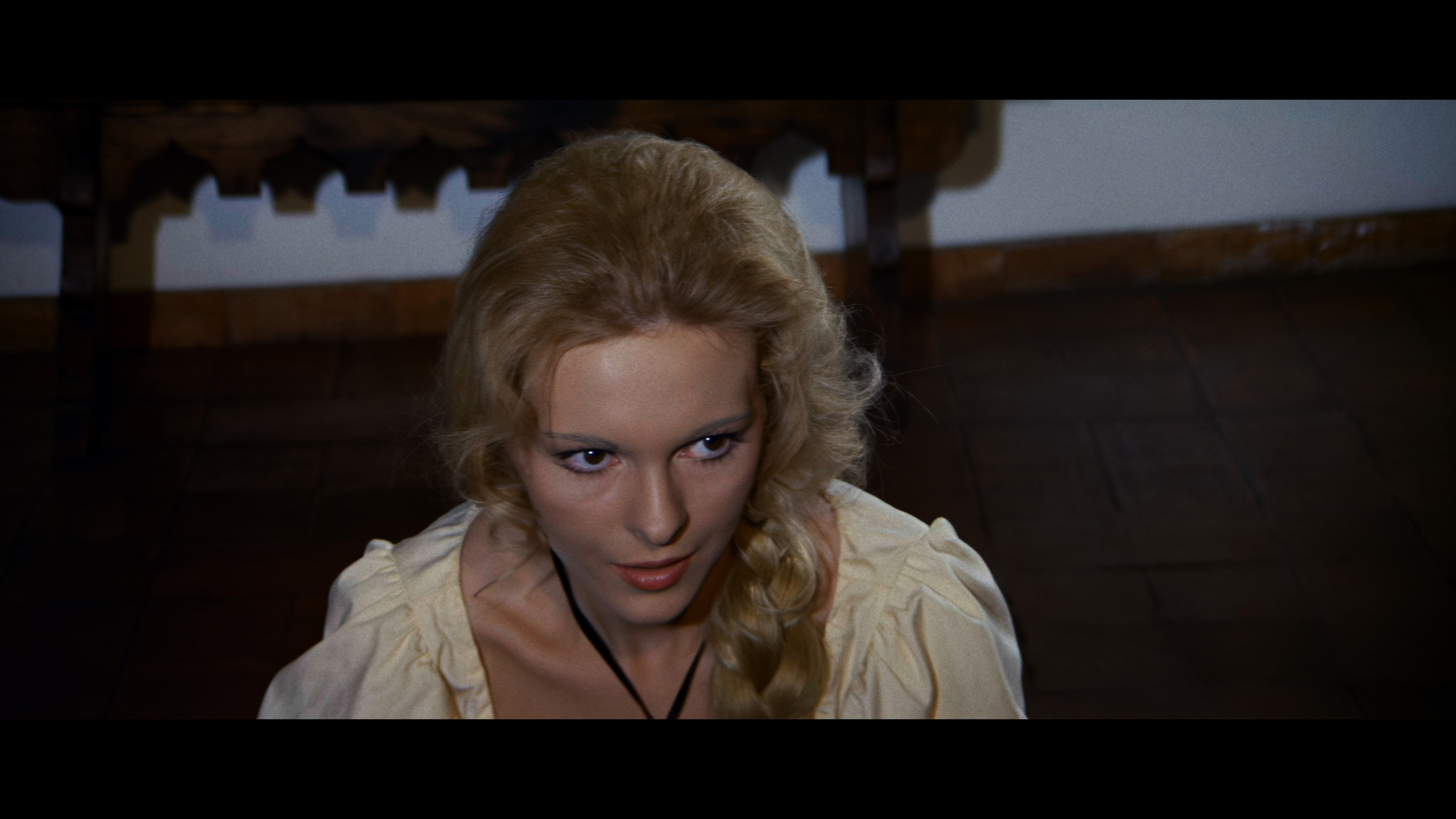 figure as a man so firm in his beliefs and warped principles that he doesn’t comprehend the full damage being inflicted by his gavel. Unfortunately this treatment also makes him a less menacing and compelling figure, despite Lee’s usual commanding performance (mostly confined to sitting behind benches and desks). Otherwise the story is pretty much the same as Reeves’, with a young couple (Rohm and German actor Hans Hass Jr.) torn apart by the misguided religious persecutions inflicted by blind justice. The Bloody Judge also bears a resemblance at times to another Franco/Towers production, Justine, by playing like a costume melodrama punctuated with an odd nasty torture scene that seems to have strayed in from a different movie.