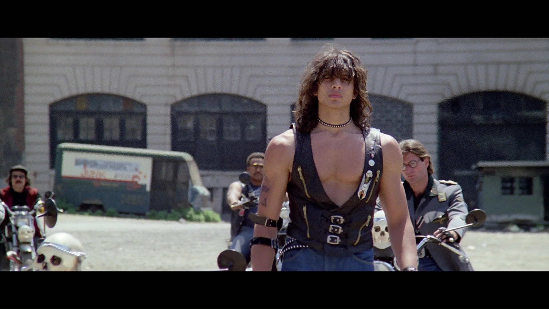 Set eight years in the future (and seven years before Carpenter's film), our saga involves a long-haired, muscular Trash (17-year-old Gregory), who runs a gang called the Riders in the Bronx. As the opening titles put it, "1990. The Bronx is officially declared 'No Man's Land.' The authorities give up all attemps [sic] to restore law and order. From then on, the area is ruled by the Riders." The nefarious Manhattan Corporation has its sights on taking over the crime-infested, decaying hellhole by painting the area as an unsalvageable wasteland, including sending in their nastiest shotgun-toting operative, Hammer (Morrow), in disguise as a mailman to do their dirty work. Meanwhile Trash starts to fall for a mysterious young woman, Ann (Girolami, Castellari's daughter), who has stumbled into the middle of this turf war