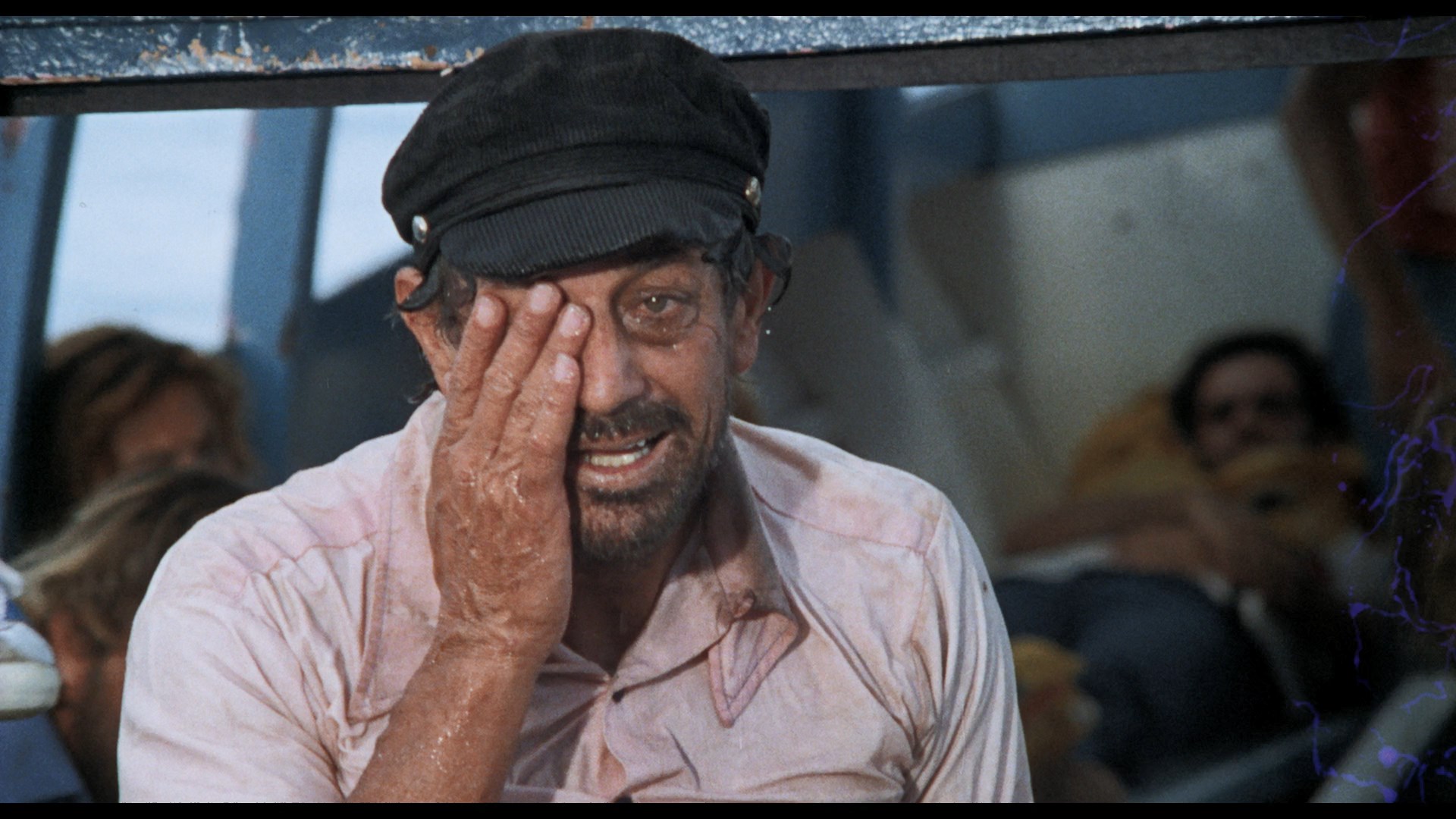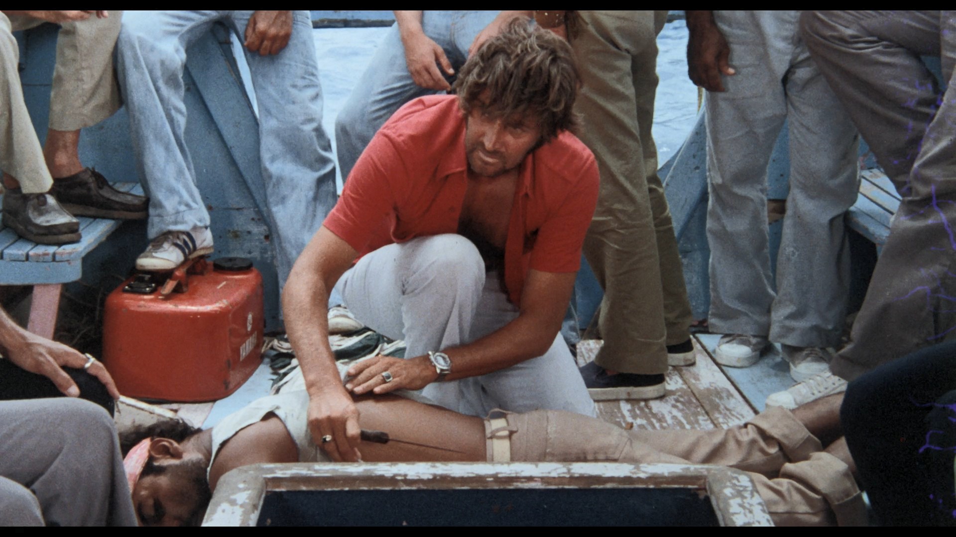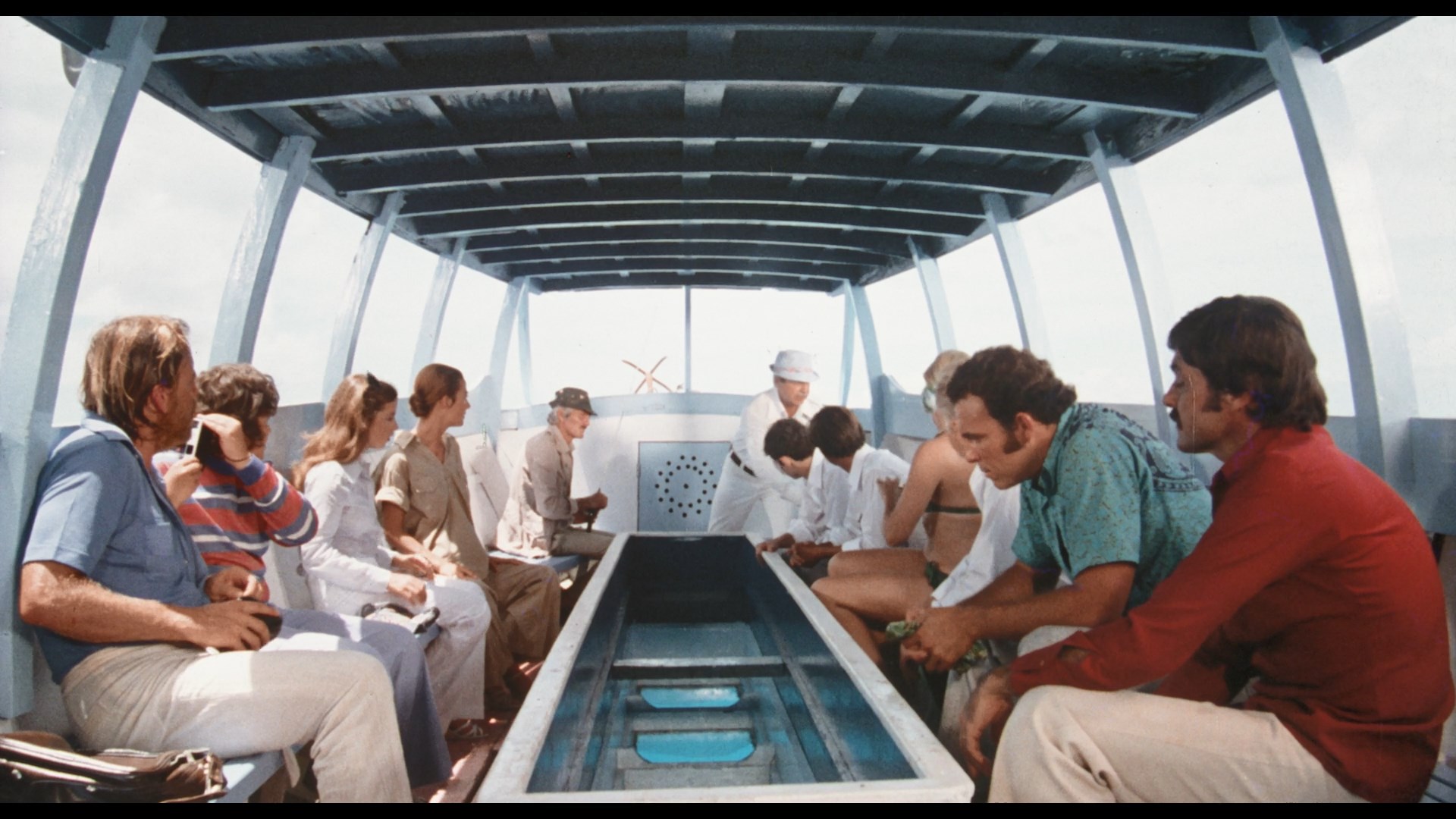 Lionel Stander, who likes to chomp on his pipe and rail against unions. Three guys are also on a small fishing trawler in the area, too, and get word on the radio of a cyclone approaching. As everyone scrambles to get to the nearest islet, the storm hits suddenly with full force, resulting in a plane crash that sends the survivors scrambling onto the Moby-Dick for survival. However, by this point they're all swept far out into the middle of the ocean with only a tiny reserve of drinkable water. As the days stretch on and the wounded go downhill, things take a turn for the worse with cannibalism and a shark attack waiting in store as the officials back on shore, stuck without working phones or telegraph machines, scramble to find them before it's too late.