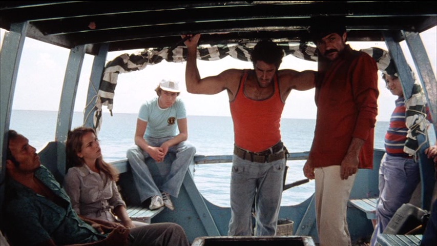 the Damned) and mostly sat around ignored until Synapse Films released it on DVD in 2005 with a colorful widescreen transfer of the standard English version. Extras on that disc include an alternate credit sequence as Terror Storm and bonus trailers including Tintorera, Danger Girls, The Deadly Spawn, and Olga's Girls, all of which should be programmed together for a film festival someday in that exact order. The Vinegar Syndrome Blu-ray marks the first time both the English and Spanish versions have been collected together, the former from a good theatrical print that's brighter and much more detailed than the earlier DVD with more image info visible on the edges. There's some visible element damage on the right side during one reel (see the fifth frame grab comparison below), but otherwise it's in pretty good shape. The Spanish version is another fresh 4K scan from the negative and looks about as good as it could; interestingly, the color processing between the versions is a bit different with reds in particular looking more subdued and natural in the Spanish but more hot and orange-leaning in the English one. The DTS-HD MA 2.0 mono audio is fine for both. In "Surviving the Cyclone" (18m29s), Cardona III returns for another exploration of the making of the film (he acted again in this one, too), explaining how this was made in quick succession after Tintorera and The Bermuda Triangle with an eye on global distribution all the way. He also notes that some different takes were done for the Italian version as well, though that version isn't included here and was reportedly very heavily cut. Then in "The Eye of the Cyclone" (32m36s), Iacono talks some more about being a producer in Mexico after some disastrous releases in Italy, the Lando Buzzanca comedy in Italy that changed the course of his career, the local logistics necessary to pull off the plane sequence, and even working with the Mexican Navy. Finally in "Beware of Sharks" (16m27s), Baker chats over Zoom with Brad Henderson about meeting Cardona, loving the experience in Cozumel, the iffy nature of Mexican stunt work, and her refusal to jump in the water with a shark even if it was "tired!" A gallery (2m39s) of stills and a pressbook is also included. Vinegar Syndrome (Spanish version) (Blu-ray)