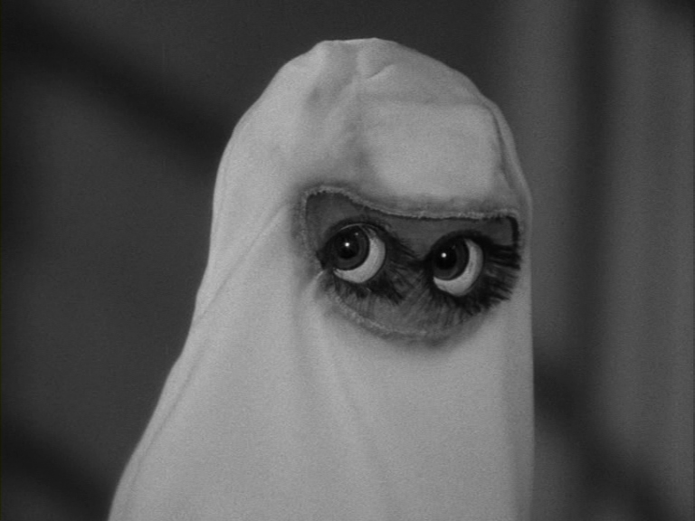 First we have Supersonic Saucer, a 1958 film penned by Frank Wells (son of H.G.) in which some prep school kids visiting an observatory at night spy a flying saucer, much to the disbelief of their chaperone. The children who can't go home for the holidays are stuck on the school grounds, where an alien visitor from Venus soon rears its head the following afternoon: a big-eyed, hijab-wearing creature named Meba who can transform into a cartoon flying saucer and telepathically tell them its his home planet. Of course the moppets decide to make friends and keep the pint-sized secret around for the vacation. Unfortunately Meba takes everything they say literally, which leads to mishaps involving accidental theft, bank robbery, and spontaneous combustion. Naturally some criminals are lurking in the wings, too, which leads to a mildly dangerous climax.