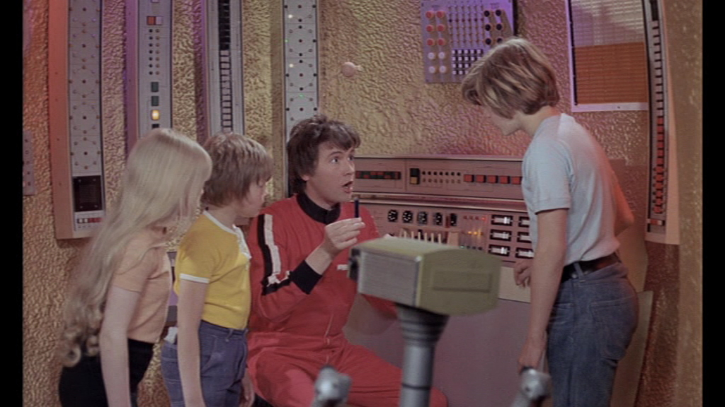 Next we jump to vivid color for the 1972 offering Kadoyng, an off-kilter yarn in which three kids out in the woods are startled when a gold spaceship shaped like a giant (American) football turns up with a clumsy human-like visitor emerging on a ladder. As it turns out, the traveler (Maguire) also has the ability to teleport. He claims to be from Stoikal , a "super planet" filled with "mental and physical giants" (which would make him a bit of a runt). Oh, and he has an extrasensory ball on a stalk sticking out of the top of his head (which has to be covered with a top hat). Inside the ship is an unseen companion on the ship named Babble, whose true nature will become apparent later, and of course the kids decide to bring him home and introduce him