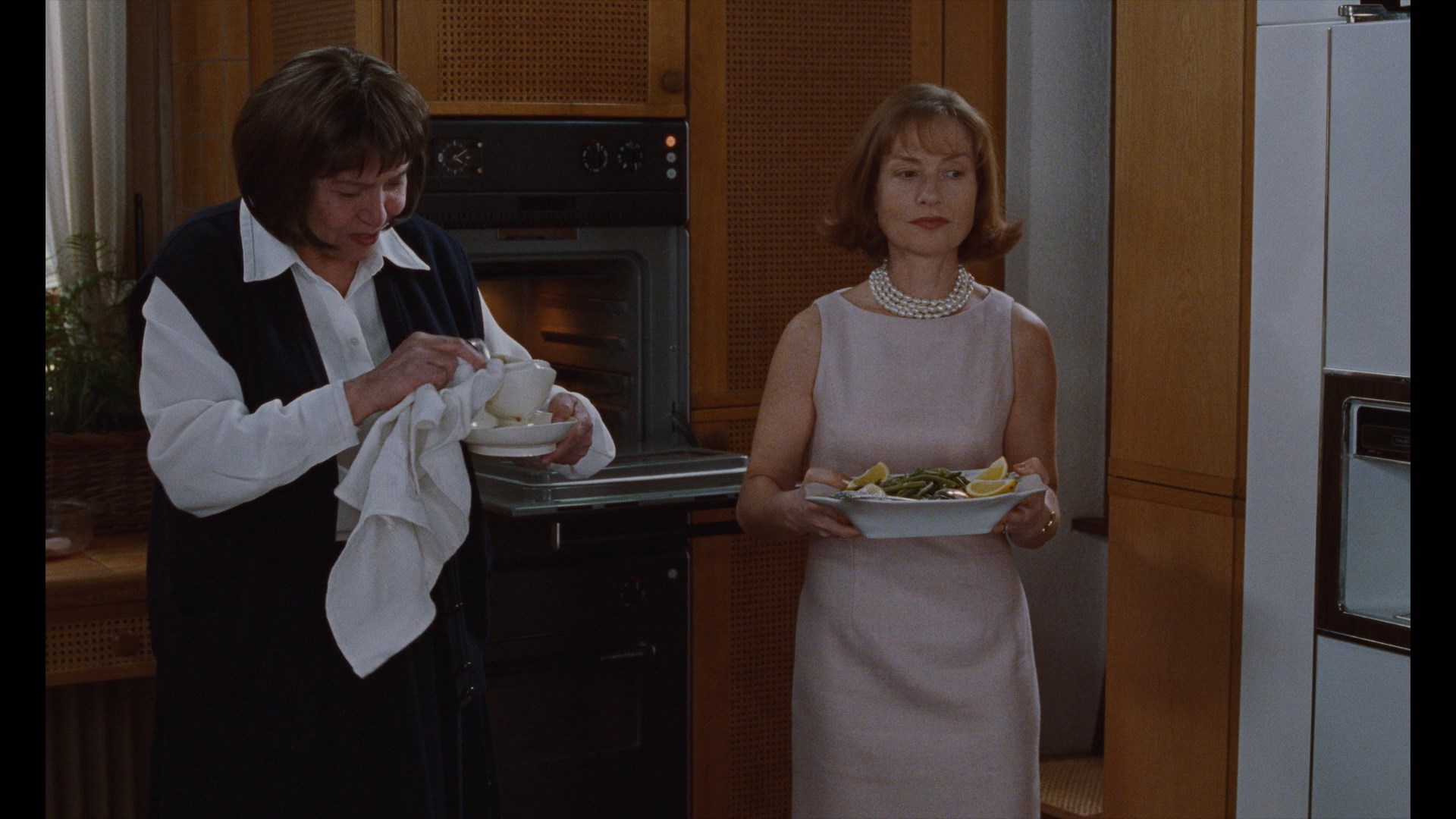 Cérémonie. Released in the U.S. by New Yorker Films both theatrically and on VHS, this eventually went over to Cohen for a pretty nice Blu-ray release in 2016 featuring a Major and Klein commentary, a reissue trailer, and a "Many Forms of Love" interview with Cluzet (42m32s) by New York Film Festival director Kent Jones covering the actor's work with Chabrol. The Arrow Blu-ray is the only one of the second batch to retain the yellow leaning, though it's toned down here relatively speaking and not that bad once your eyes get used to it after a while. Otherwise it looks good with fine detail throughout. A new commentary by Barry Forshaw and Sean Hogan helps put the film in context within Chabrol's career and really goes into the nature of how his tendency to crank out films at a rapid pace hampered his status among the auteur-centric crowd but ultimately may have helped him in the long run. In "Chabrol’s 'Soap Bubble'" (14m36s), Catherine Dousteyssier-Khoze (author of Claude Chabrol: The Aesthetics of Opacity) uses Chabrol's own term for this film (thus the title) as a jumping-off point for analyzing some of his more playful efforts like this and Blue Panther, with an exploration of how production design choices reflect his twisty stories. The Zoom conversation "Film as a Family Affair" (38m11s) features Chabrol's stepdaughter and frequent assistant, Cécile Maistre-Chabrol, chatting about her first exposure to show business through the theater, their working relationship, his pun-loving personality, and his methods on set. Also included are a Magny intro (2m28s) about the film's significance to Chabrol despite its middling box office reception in France, scene specific Chabrol commentaries (24m20s), an EPK-style vintage making-of featurette (8m22s) with the cast and crew, an interview with Huppert (25m38s) conducted by MK2 covering her first meeting with Chabrol and their working process together, the French trailer, and a stills gallery.