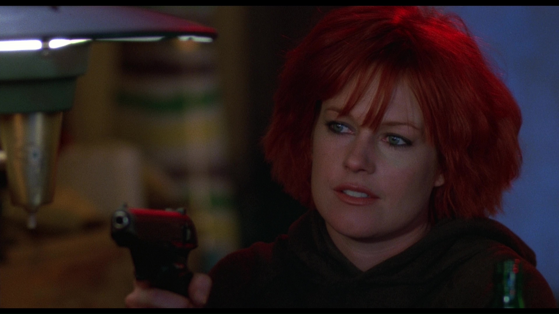 Hot off her starmaking turns in Body Double and Something Wild, a scarlet-haired Melanie Griffith makes a strong impression here as E. Johnson, a gun-toting, Mustang-driving mercenary tracker hired by rich businessman Sam Treadwell (Andrews) to help him locate a replacement android for his female companion, Cherry 2000 (Gidley), who's irreparably glitched out. Together they have to infiltrate the dangerous area known as the Zone to retrieve another now-rare model from the one remaining factory nearby that may have one, but in the process they come across a motley crew of colorful characters including the villainous Lester (Trancers' Thomerson).