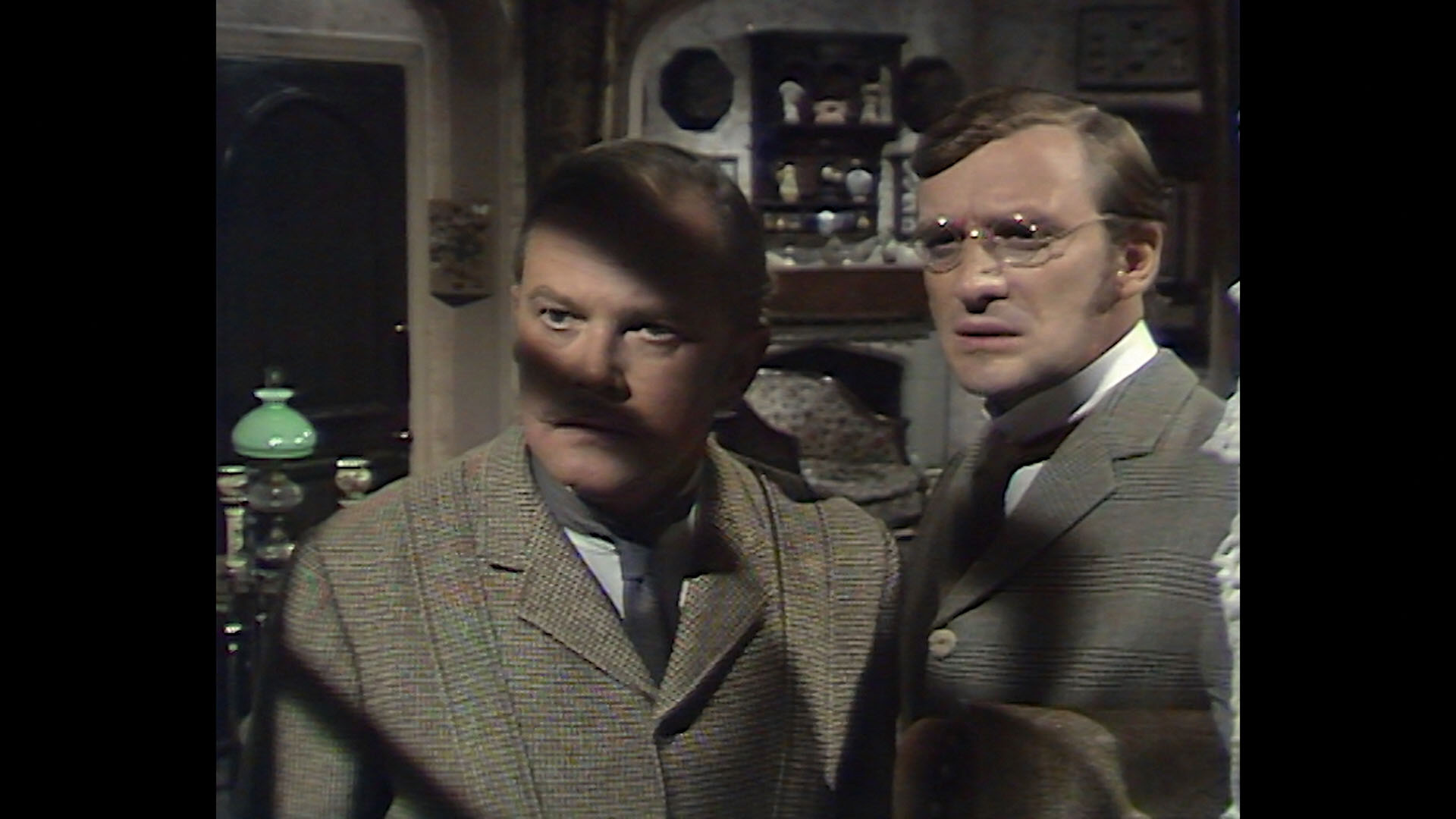 shows looking as good as they could given the fact that they were shot on tape and come from the only surviving masters, while extracts of otherwise lost tales are also included. We start off with "episode 1," the earliest surviving of the '68 run and the third one to be aired: A Study in Scarlet (50m26s), in which Holmes and Watson are summoned to an abandoned house where a dead American has been discovered with the word "RACHE" written in blood on the wall. The death by poisoning and a woman's ring lead our heroes on a trail of conspiracy involving an international crime ring. The first written Holmes story, this one has been adapted many times (most definitely in the later TV series with Jeremy Brett) and is still plenty of fun to watch here with Cushing (frequently sporting a top hat and gloves) still in fine form as Holmes almost a decade after his first classic interpretation for Hammer in 1959's The House of the Baskervilles. (Incidentally, a much older Cushing played Holmes again as a one-off production in 1984, The Masks of Death, which was everywhere on VHS back in the day). This episode (which looks nice apart from some occasional rolling tape damage) can be played with an optional 30-second countdown clock and sports a new commentary by Kim Newman and David Stuart Davies, which goes a fine job of untangling the history of this series including its official title and season ranking, the process of licensing Doyle's short stories and novels back then (with anything featuring Moriarty off limits for a while), and the ins and outs of all the participants seen here as well as the narrative traits running throughout this show.