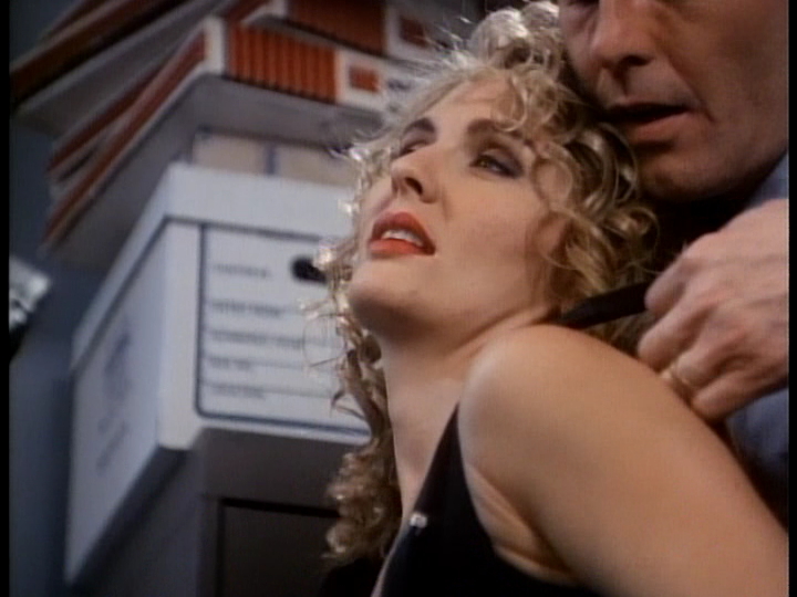 he probably shot in about an hour while stopping by the set. Top-billed Bauer (who already headlined one of the best proto-erotic thrillers, Thief of Hearts, and had recently appeared in Raising Cain) actually doesn't get all that much screen time either; he actually had a lot more to do in two other similar 1994 titles, Stranger by Night and Woman of Desire. Not exactly the most charismatic actor, Laughlin really gets way more screen time and does what he can with his sleazy part, groping and sweating his way through the convoluted plotline. However, this being a Mundhra film, you get plenty of the holy trinity of Shower, MacDonald, and Beaman, who writhe around a lot in lingerie while that nonstop saxophone blares on the soundtrack. It's nothing close to great art, but it is pretty amusing and exactly what you'd expect given the cast and storyline. Plus you get a sex scene in a bunch of stacks of banker boxes, which has to be a first. Yeah, it's all basically a rip-off of the same year's Disclosure with the whole gender-switching angle siphoned out, but there's still plenty of low grade amusement to be had if you're in the mood.