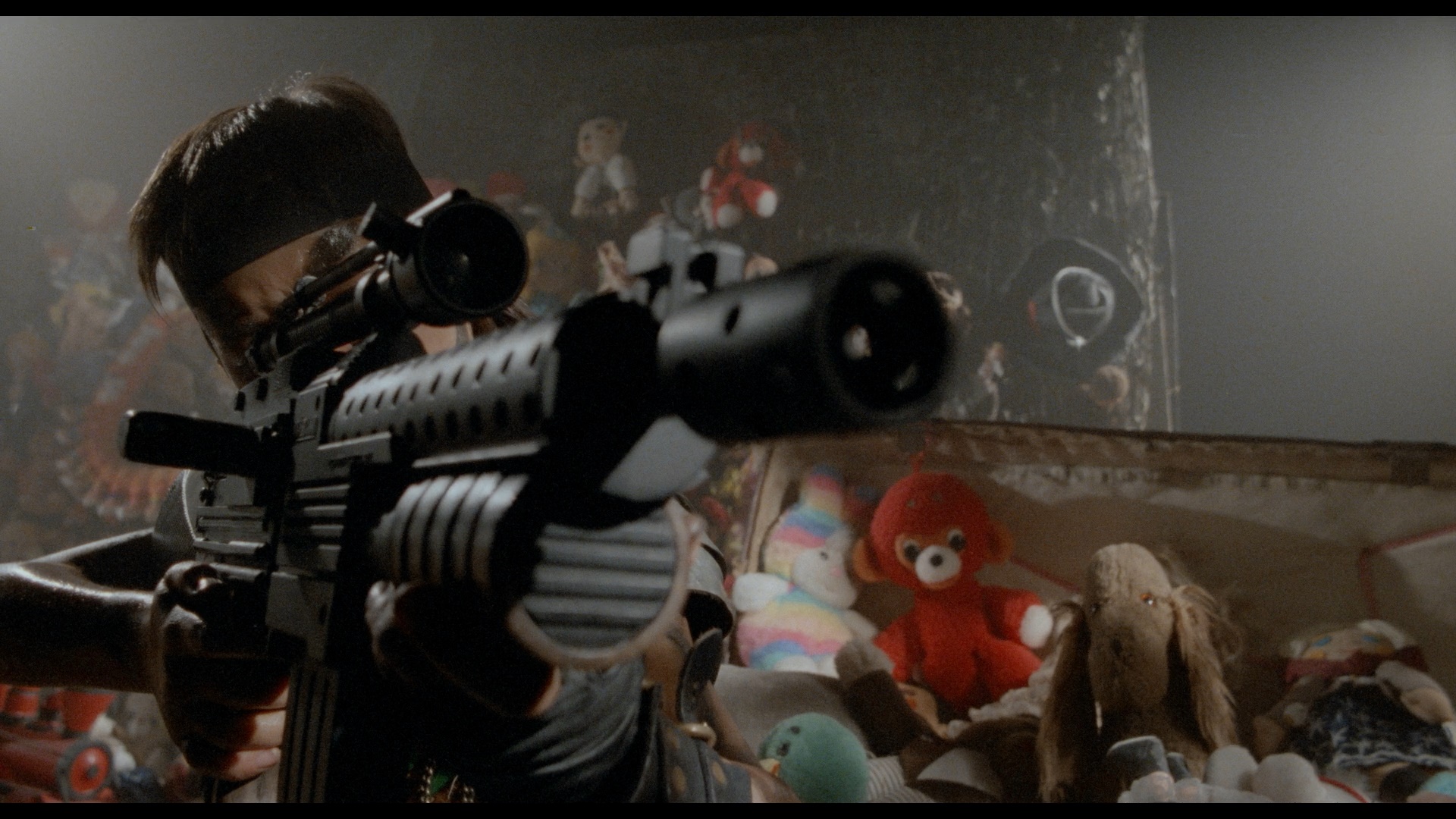 The second disc, a DVD (which is Region 2 versus the region-free Blu-ray), features the same contents in standard definition. The third disc is an extra PAL DVD of separate bonus material, starting off with the new feature-length documentary, "Jouets Interdits" (85m8s), with Manzor looking back at how the film came about during a drought on genre cinema in France, the dedication to his "film father" Alain Delon, the miniatures needed for the ambitious 360-degree shots, and the one scene he hates and wishes he could cut. "To Become a Man" (39m10s) with Musy focuses on how he ended up being cast in the lead of his father's film (after appearing in his previous film with Delon, The Passage) and his thoughts on the war obsession of the character he played, as well as the inspiration for the script when he personally stopped believing in Santa. A vintage interview with a young Musy on the set (8m49s), along with Floersheim and production designer Eric Moulard, offers a different perspective as the young boy chats about watching Delon; some interesting VHS-shot footage from the shoot is included as well. Also included are a storyboard-to-scene comparison (6m35s), a music video for the "Merry Christmas" theme song by Bonnie Tyler(!), and "Pre-Trailer Model Shots" (2m41s) showing narrated footage of the swirling camera shot through the model. Some of the extras were produced in collaboration with