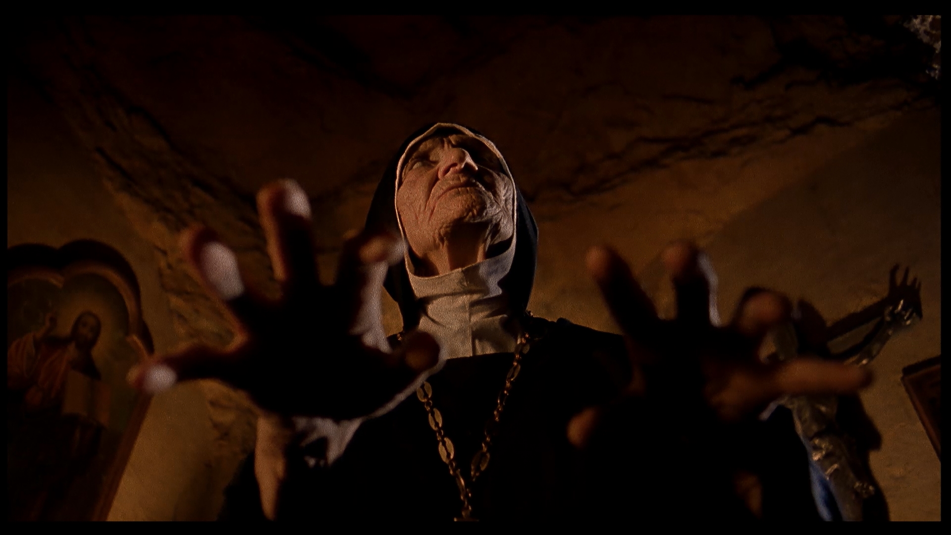 After that release the film fell into obscurity for a while until Severin Films revived it in 2017 for separate Blu-ray and DVD releases that offer the best-looking incarnation of the film, which is still speaking relatively given its video history and the challenges presented by its stylized look that often turned to mud in standard definition. Deep blacks, eye-popping reds and browns, and improved detail all make for a stronger viewing experience transferred from the original negative, though the frequently dark lighting and funky film stock also look even more inconsistent with the heightened resolution. (You can see comparison frame grabs from the DVD by clicking here or here.) The bit rate is consistently beefy but the film often has a coarse, chunky texture to it that's less evident in motion than in frame grabs but definitely odd looking; given the film's threadbare technical capacity with the Ukraine film shoot, this may be about as good as it gets. Like the DVD, the image is slightly windowboxed. Oddly the English stereo audio is only presented in lossly Dolby Digital 2.0 while the commentary is ported over in LPCM, which seems a bit backwards; optional English subtitles are included.