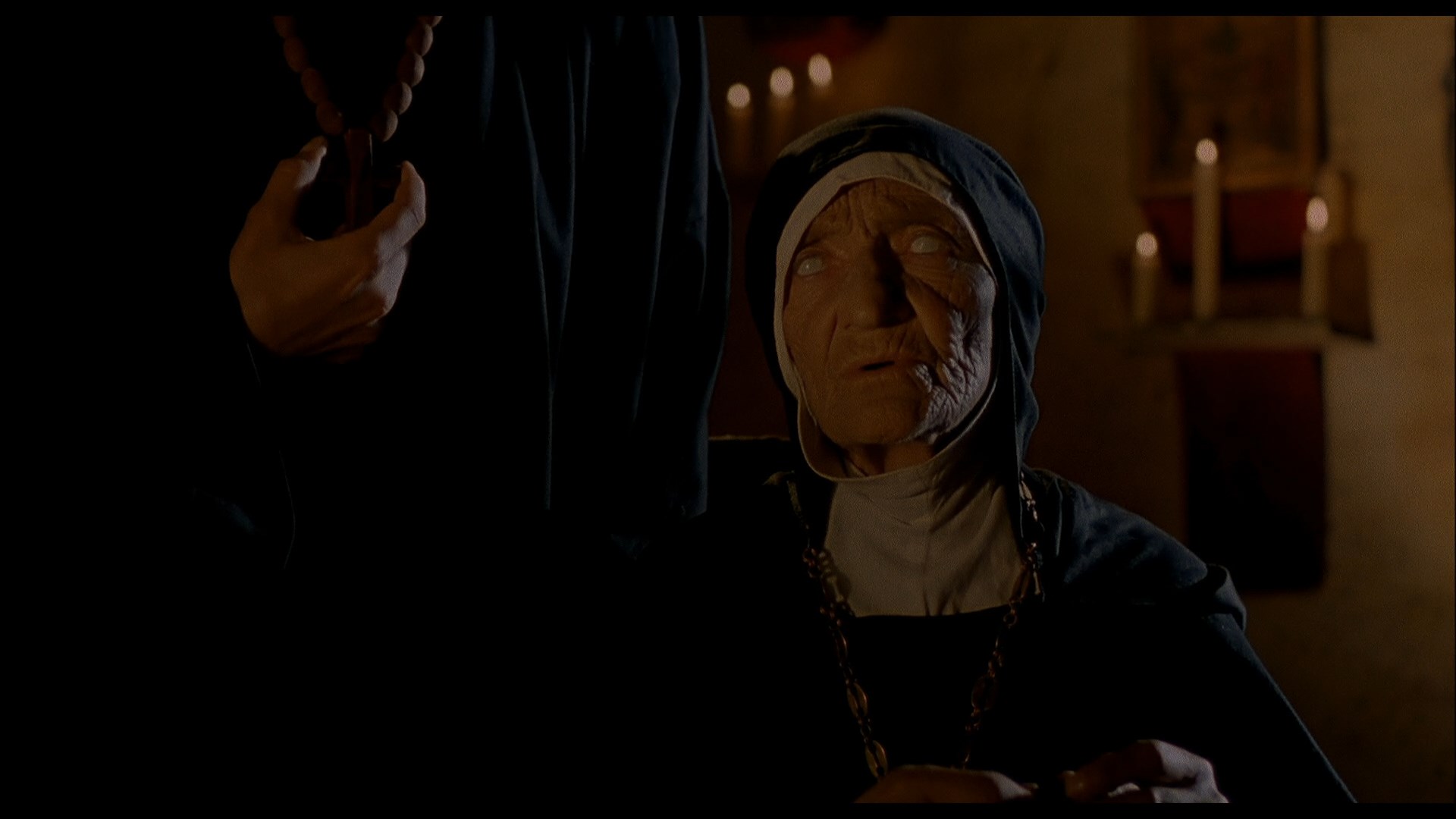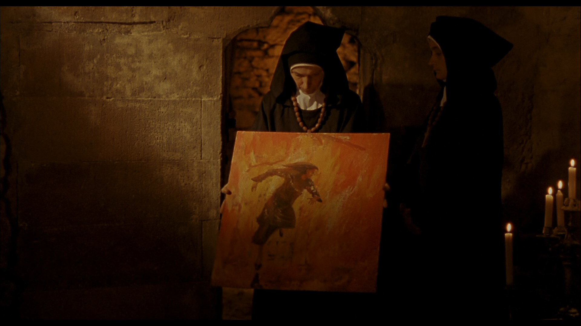 In the puzzling prologue, an isolated religious establishment on a stormy island is beset by problems originating from a stone medallion. Nuns trudge through the landscape carrying fiery crosses, a young girl is repeatedly stabbed until the water runs red with her blood, and a priest trapped in an underground flood meets the wrong end of a broken shaft of wood. Flash forward twenty years later, as young Elizabeth (Salter) arrives at the aforementioned island to discover why her father has been sending payments to the nuns ever since her mother's premature death. The Mother Superior (Kapnist) and her charges prove less than helpful, so Elizabeth takes to the library to find out the horrible secrets which have left her with nightmarish flashbacks involving a long lost sister. Meanwhile the occasional malicious nun tries to shove her out a window or stab her, leaving Elizabeth more determined than ever to uncover the diabolical secret which ties her to this wicked order.