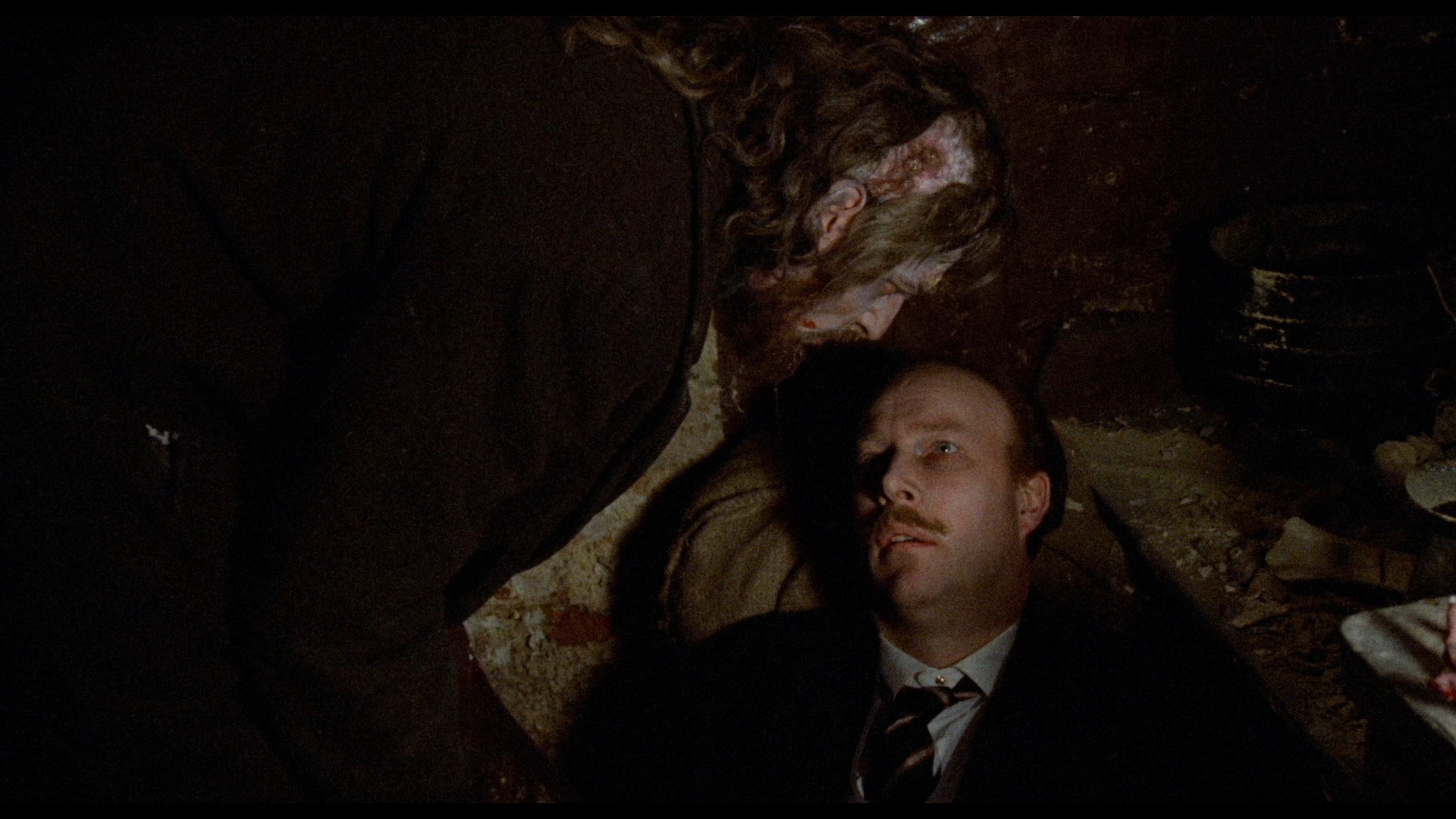 In 2017, Blue Underground gave the film its Blu-ray debut as a dual-format release (including a DVD as a second disc) with a fresh 2K scan sporting the original Death Line title. Anyone familiar with this film knows how grainy and dark it can be, and thankfully that look has been maintained here with the original grain kept intact and not smudged away at all. Colors are extremely vivid at times (especially the opening credits with those multi-colored lights) and dull and brownish when required, while the darker scenes exhibit more detail than before without being overly brightened. The DTS-HD MA English mono audio sounds robust and can be played with optional English SDH, French, or Spanish subtitles. There's also an option to play the film with an audio commentary with Sherman, producer Paul Maslansky, and assistant director Lewis More O'Ferrall, moderated by David Gregory. It's a very candid and often funny track that starts off talking about their displeasure with the reedited ("butchered") AIP version sold out from under them, then covers how they managed to sneak around London city regulators by submitting a doctored spy script instead of this one to shoot in one key station, the joys of working with Pleasence, Armstrong's relentless commitment on set to staying in character, and the connections to everything from Monty Python to Frenzy.