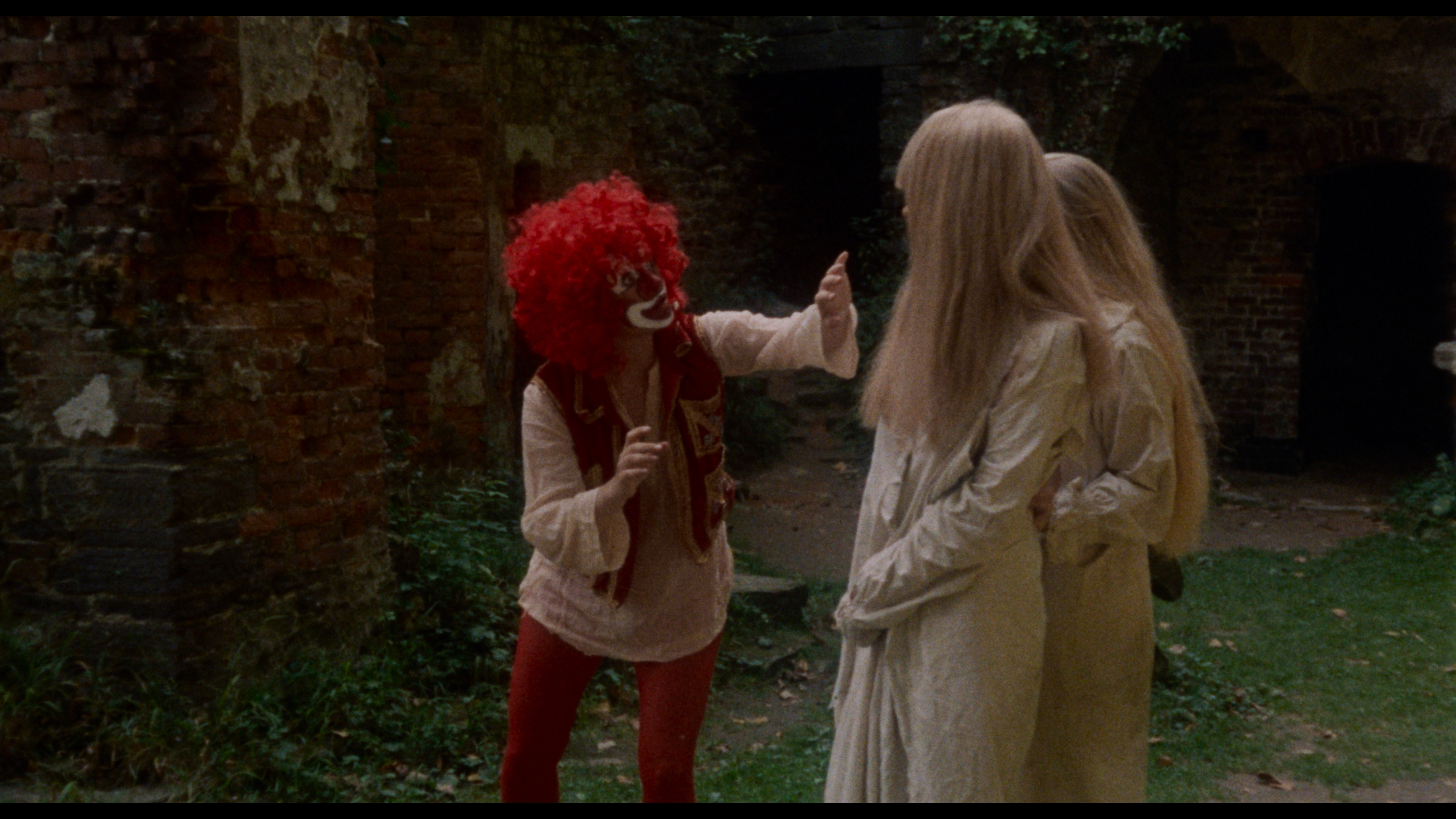 local tavern, the Captain experiences Macbeth-style visions of the maidens, their hands and eyes stigmatized with blood. He flees to Tina, who leads the wreckers back to the scene of their crime. The two girls are still there, barely alive, and escape to the haunted ruins of a church where a powerful spirit resides inside a cell. After meeting the spirit's handmaiden (a woman dressed as a clown, of course), the girls release him and engage in some sins of the flesh. In gratitude, the spirit grants them supernatural powers which, until dawn, will allow them to seek revenge.
