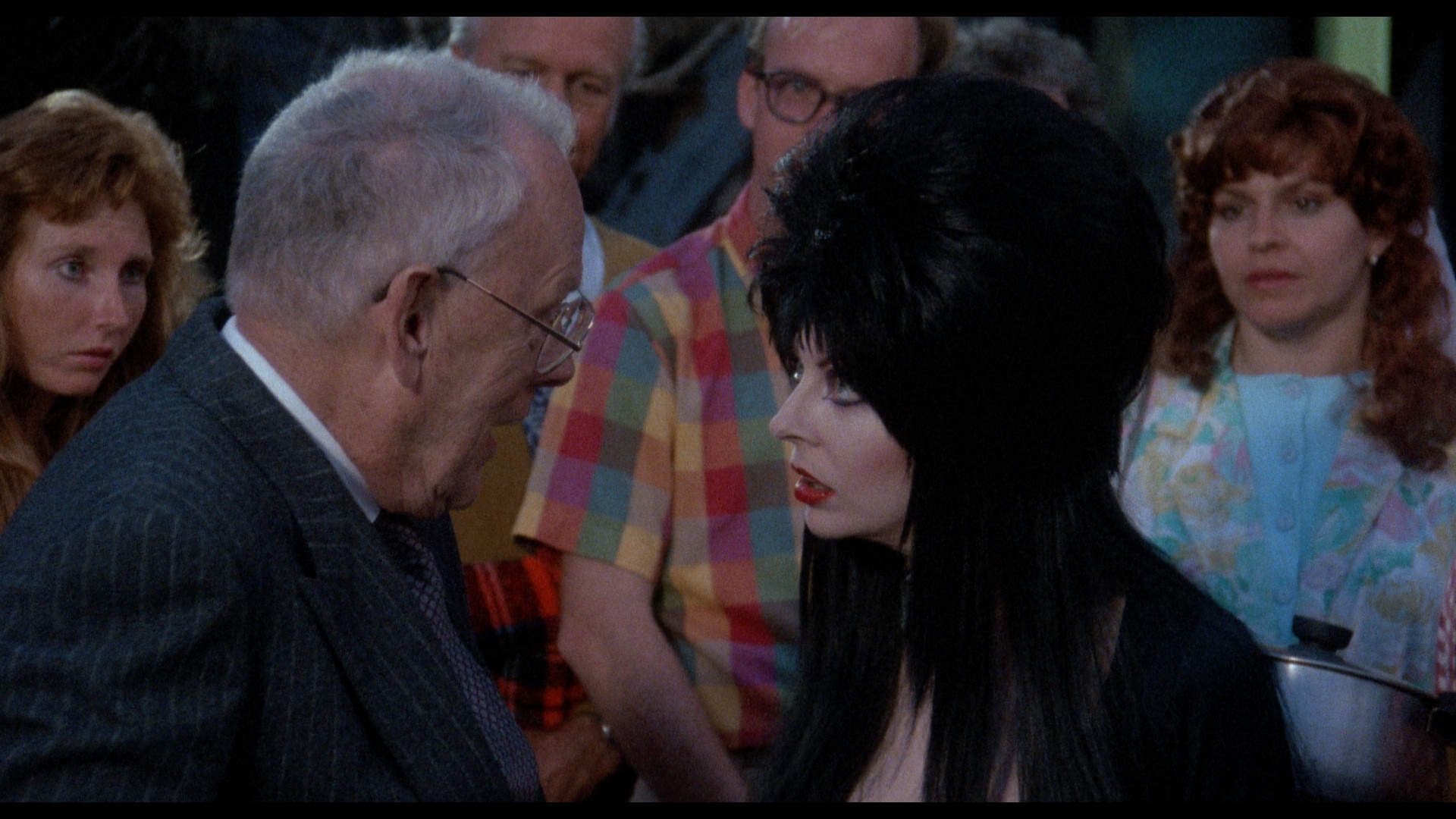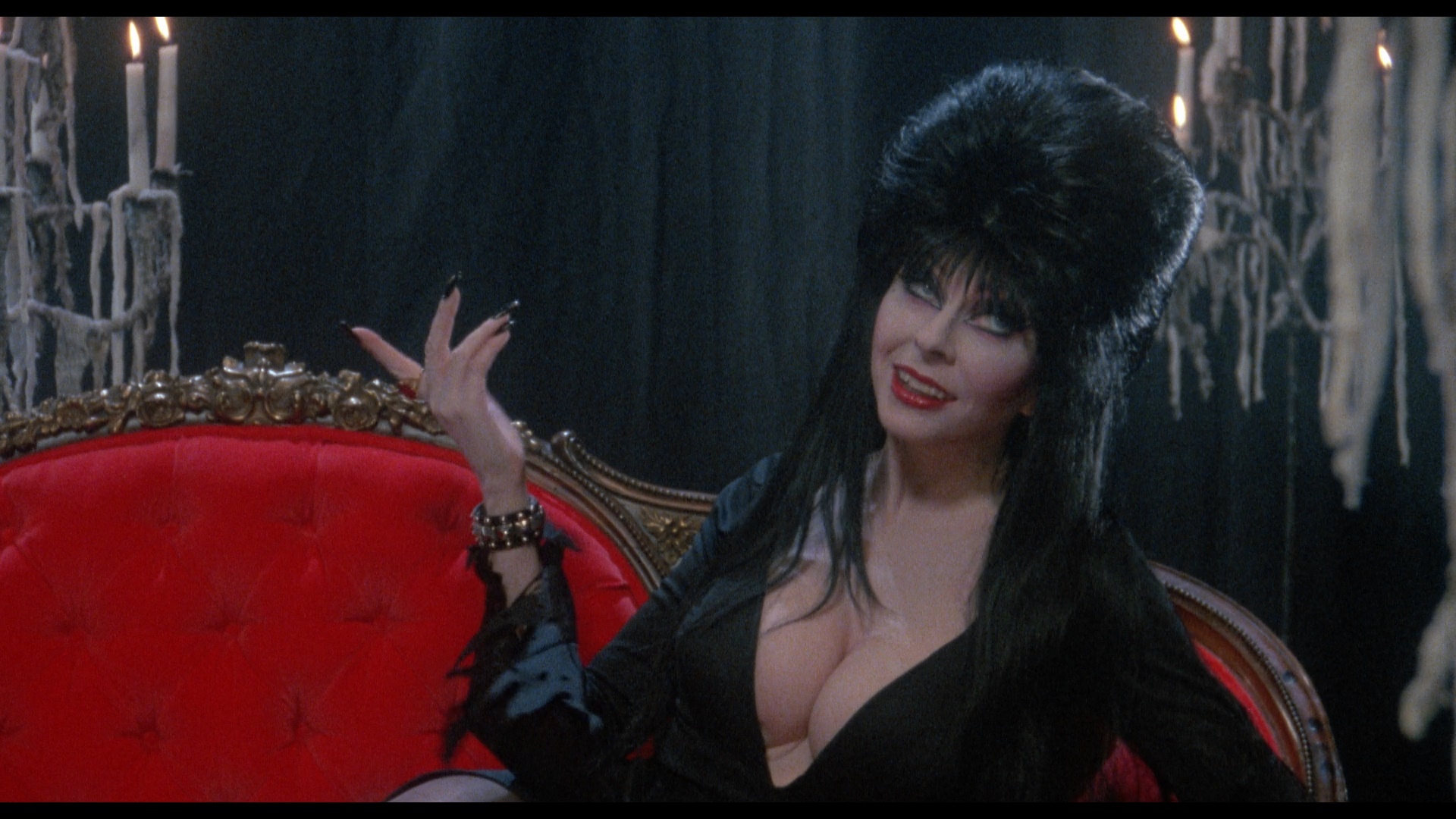Making of Elvira: Mistress of the Dark" (97m4s), which is touted here as a newly-revised 2018 version and features pretty much every single available person who worked on the film chatting about its creation including in-depth looks at the special effects, the casting, the rationale behind some of the character choices (including her preference for the character of Bob), and the budgetary issues, among many, many other topics. In "Recipe for Terror: The Creation of the Pot Monster" (22m13s), you get another look at the creation of the effects with many of the same participants explaining how they went from concept sketches to reality. Separate extensive galleries are also provided for production stills, behind the scenes shots, special effects photos, storyboards, New York premiere coverage, and miscellaneous material including invites. The disc closes out with the U.S. theatrical and teaser trailers, while the first pressing also contains an insert booklet featuring new liner notes by Lundquist and comments by Sam Irvin on the 2012 audio commentary. In 2025, Arrow revisited the film as a UHD release featuring what's touted as a "brand new 4K restoration," and the difference is obvious with a far more dynamic color scheme including blazing blood reds and healthier flesh tones throughout. The HDR10-compatible Dolby Vision grading looks great and gives the stylized, comic-influenced look of the film quite a bit of extra punch; detail is also finer throughout, while framing looks identical. All of the extras are included here, with the film itself featuring the usual 2.0 stereo mix and the collector's booklet included in the packaging.