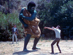 Disc two packs in plenty of additional material, starting with a hefty video-oriented look at the film's creation: a silent, seven-minute reel of outtakes from the production, some very entertaining test footage of the ape beast (called the Taurus by its creators), a seven-minute Muren interview in which he (somewhat redundantly) covers his memories of monster movies and the creation of Equinox, and a nine-minute featurette of cast interviews (featuring Hewitt, Duron, and future WKRP in Cincinnati actor Bonner). An earlier silent student film by Kevin Fernan, "zorgon: The H-Bomb Beast from Hell," is an amusing bit of monster goofiness featuring all three of the main behind-the-scenes men from Equinox as well as early work by Rick Baker. A "Dave Allen Appreciation" nook within the disc contains an animated fantasy entitled "The Magic Treasure" (plus an essay about the film by James Duron), Allen's wild '70s Volkswagen commercial with King Kong (plus silent test footage), and a Chris Endicott essay about Allen's animation career entitled "Kong at Cascade." The exhaustive "Equiphemera" area, which is broken into several sub-categories, features a huge amount of visual and written material about the film, including plenty of essays, stills, production shots, and much, much more; prepare to feel your remote finger going numb after this one! Finally you get the original theatrical trailer (which is quite good) and two fun radio spots, plus a booklet featuring remarks by George Lucas and Ray Harryhausen plus notes by Brock DeShane.