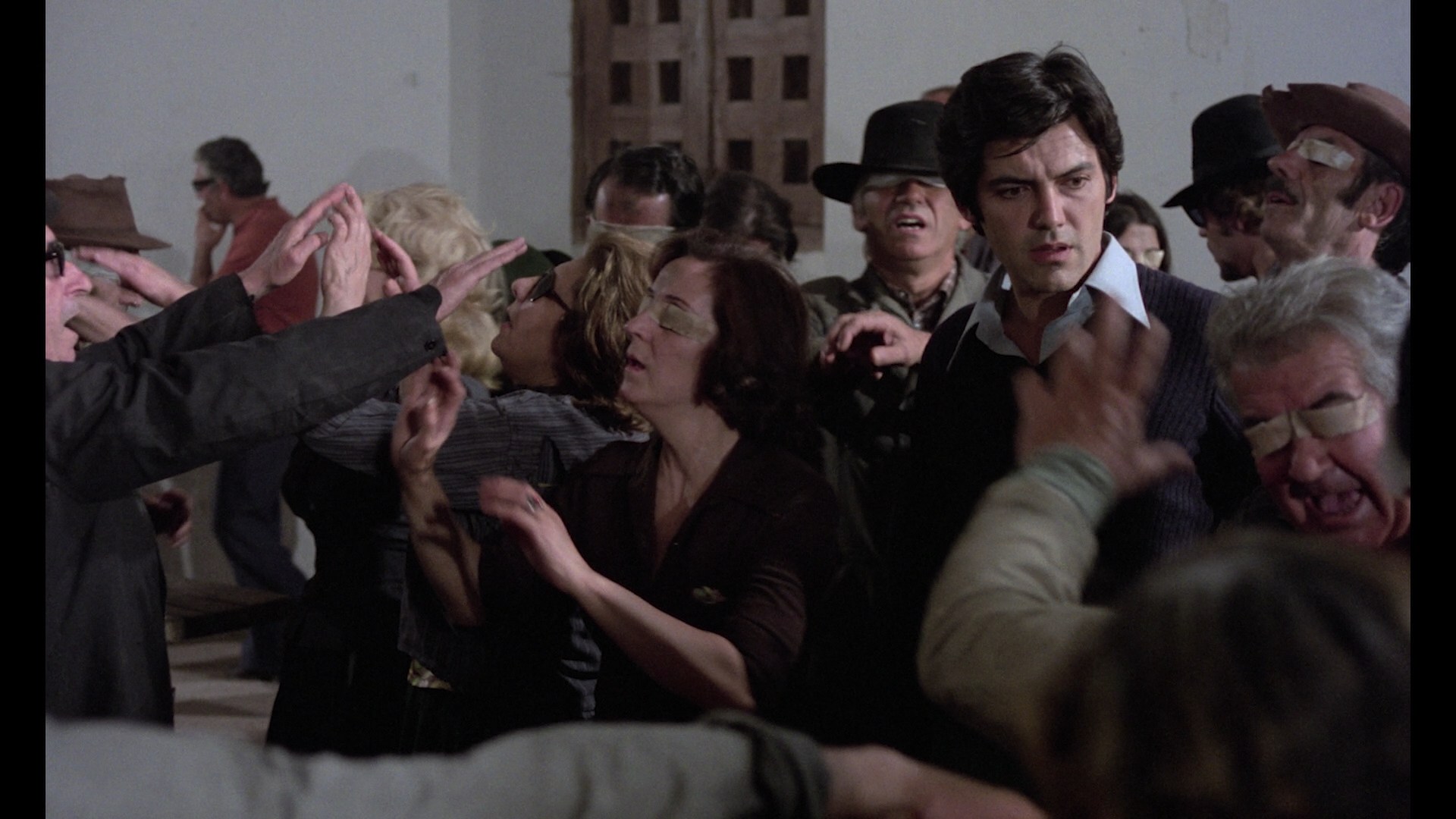 Werewolf, actor Paul Naschy and prolific director León Klimovsky turned out the peculiar and strangely haunting horror/sci-fi hybrid The People Who Own the Dark, which gets disc four all to itself. Inspired in equal parts by I Am Legend and The Day of the Triffids, it's a terrific film with Naschy actually taking on more of a supporting role here as Borne, a macho hunter type who joins a bunch of debauched upper class businessmen and their female companions for a weekend of fun and games in the countryside. That includes gathering in the basement to put on creepy pig masks and parade the women around in see-through gowns for some kind of kinky swingers' ritual, but they're cut short by an earth-rattling explosion above that sends a blind pigeon crashing to the floor. The maid shows up blind, too, with completely white eyes, and soon they realize that some kind of apocalyptic attack above ground has rendered most of the population dead or completely sightless. As the party hounds try to gather munitions, the blind locals become bent on irrational vengeance and start to gather outside the house as those inside also find their sanity beginning to break.