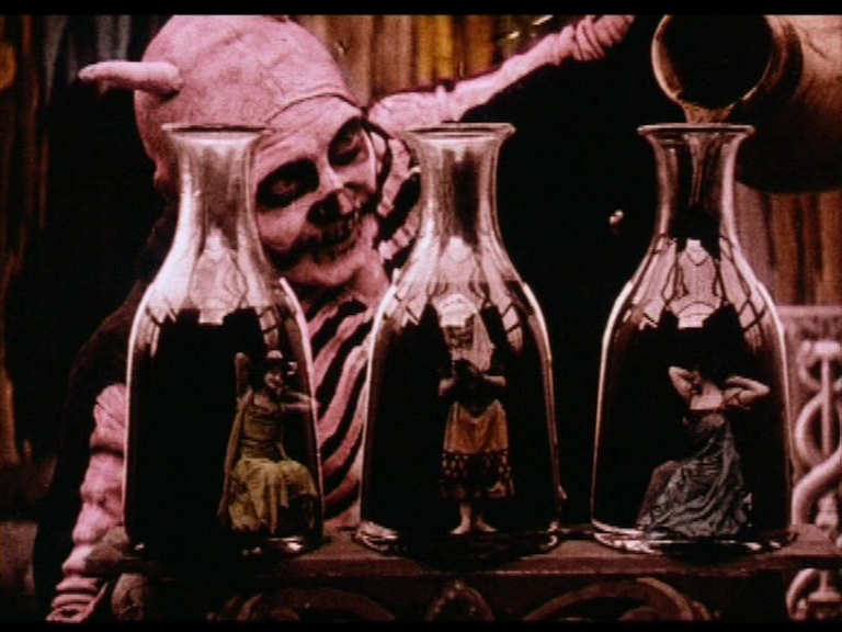 Other highlights include "L'antre de la sorciere" (Anglicized as "The Bewitched Shepherd"), which features a sorceress dazzling a jilted shepherd with visions of skeletons and gender-changing phantasms; the sweet "La fée printemps" ("Fairy of Spring"), about a country couple longing for children during winter time; an expressionistic, 16-minute version of "Cinderella," a nifty 12-minute version of "The Blue Bird" with surprisingly ambitious costumes and effects, and a 14-minute adaptation of "Sleeping Beauty," all offering unique twists on the familiar tales; the ghoulish "Le spectre rouge" ("The Red Spectre") with a skeleton-faced alchemist performing demonic tricks including the aforementioned miniature people in glass bottles; and a really creepy gathering of devils when a girl is lured from a cemetery into the underworld in "La legende du fantome" ("The Black Pearl"). Some of the other shorts are basically fragments or slightly odd dance routines, though they have their points of interest as well, too.
