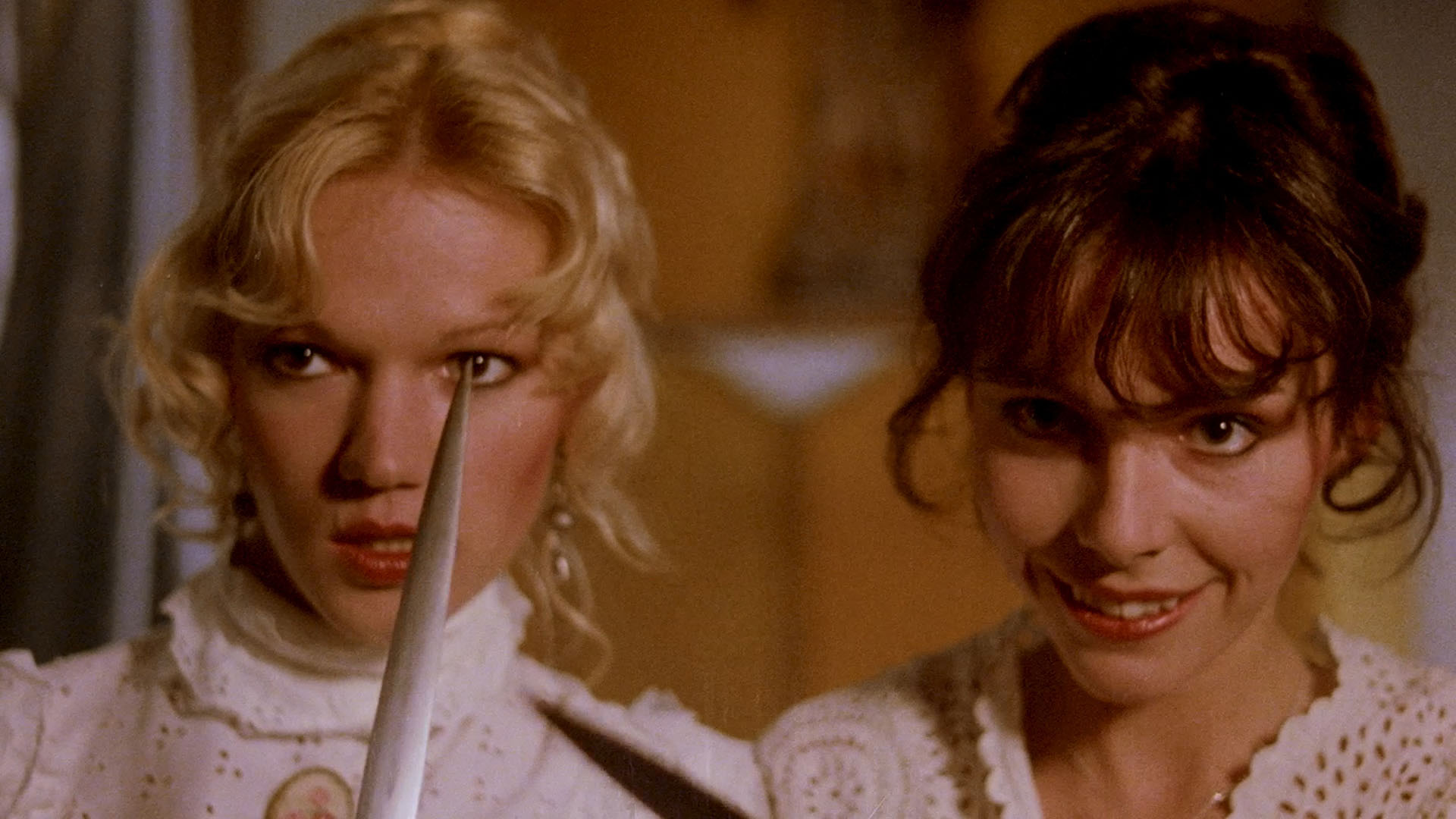 After a haunting, cryptic opening in which several well-to-do French ladies gather at a farm where animals are being slaughtered and daintily sip glasses filled with blood, the story follows the misadventures of blond hoodlum Jean-Marie Lemaire, who holds up two young women (Brigitte Lahaie and Franca Mai) at an isolated chateau. The two women apparently have little to do during the day besides rolling around on the rug for an occasional lesbian dalliance, so this turn of events turns out quite unexpectedly for our antihero. When another group of ne'er-do-wells shows up, Lahaie takes a scythe to them, and as the prologue has already indicated, turn of the century French women were not quite as naive and innocent as most commonly believed. Like most Rollin films, the ending is both tragic and haunting, with a highly memorable final image and line of dialogue.