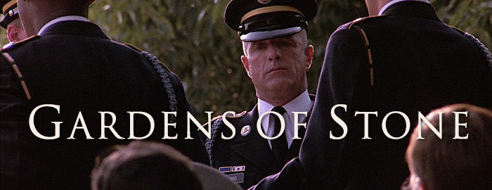 with a pair of extremely costly productions, Apocalypse Now and One from the Heart (with only the former turning out to be a success), writer-director Francis Ford Coppola spent the rest of the decade making one unexpected choice after another including a pair of S.E. Hinton teen dramas, the ambitious The Cotton Club, and even a Michael Jackson theme park short. In 1987, he returned to the theme of the Vietnam War a mere eight years after Apocalypse Now for the considerably more intimate Gardens of Stone, based on a recently published novel by Nicholas Proffitt and a comeback vehicle of sorts of James Caan after a five-year absence.