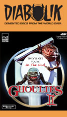 The last in the series to get a theatrical release (albeit much smaller than the first film), Ghoulies II hit VHS from Vestron in 1988 and has remained more or less available ever since in all the major formats. MGM released a DVD in 2003 pairing this up with the first film, marking the first widescreen release for both of them and featuring their respective trailers. In 2015, Scream Factory issued a Blu-ray of both films in improved HD scans from interpositives, this time with this title having options of DTS-HD MA 5.1 or 2.0 with optional English