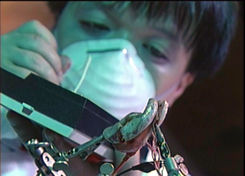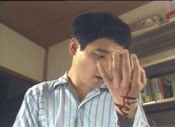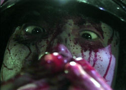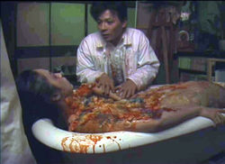 Then we switch gears to goofball comedy with He Never Dies, whose title sums up the entire conceit. Flatly shot on what appears to be very cheap video equipment, this oddball piece documents a depressed Japanese businessman's attempt to commit suicide after being dumped by his girlfriend. In gruesome detail he slits his wrists but doesn't even feel weak. Realizing he cannot die, the grinning loony resorts to driving pens through his hand, slashing his throat, and eventually earning revenge against his girlfriend and a romantic rival by... well, it isn't pretty. While the wrist-cutting is horrifically effective, the rest of the effects are graphic but more playful than anything else, buoyed along by the quirky music