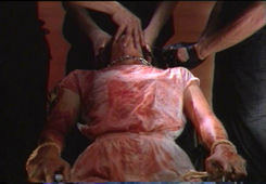 The most notorious episode, Flower of Flesh and Blood, instigated the apocryphal Sheen/FBI incident and spurred on a memorable Chas. Balun article in Deep Red; this is really video-driven sadism boiled down to its most visceral elements, a quasi-snuff sketch in which a grunting brute in a samurai costume kidnaps a young girl, ties her to a mattress, sacrifices a chicken, then carves her up for the remainder of the film while delivering giddy monologues about flowers directly to the camera. Though filled with spewing bodily fluids, screaming, and shaky, faux-realistic videography, this is less harrowing than its predecessor mainly because of the sheer hyperbole of the effects (in which every chop and hack seems to unleash torrents of blood) and the killer's bizarre appearance, which is probably meant to be some sort of commentary on feudalism's lingering fallout in Japan. Or maybe not. Adventurous viewers may want to pair this up with the earlier Japanese abduction/limb-removal study, Blind Beast, for a particularly harrowing double feature. Appropriately, the U.S. disc of Flower is packaged with The Making of Guinea Pig, a clinical behind-the-scenes chronicle of the extremely wet latex effects required to pass off each dismemberment and disembowlment. Even after this hour long documentary became an official part of the series on the video gray market, stories lingered for years about the verisimilitude of certain sequences.